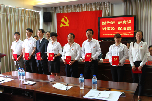 大会在庄严的《国歌》声中拉开序幕,全体党员起立,举起右臂面对鲜红的党旗重温入党誓词宣誓。然后,纪委书记张跃琼同志宣读广元公司党委《关于“七一”表彰奖励先进党支部、优秀党支部书记、优秀党务工作者和优秀共产党员的决定》,在主席台就座的领导班子成员对2012年以来涌现出来的先进基层党组织、优秀共产党员、优秀党支部书记、优秀党务工作者进行表彰。接着,总经理许祖英对广元公司深改攻坚工作进行安排部署并与各单位签订深改攻坚责任书。