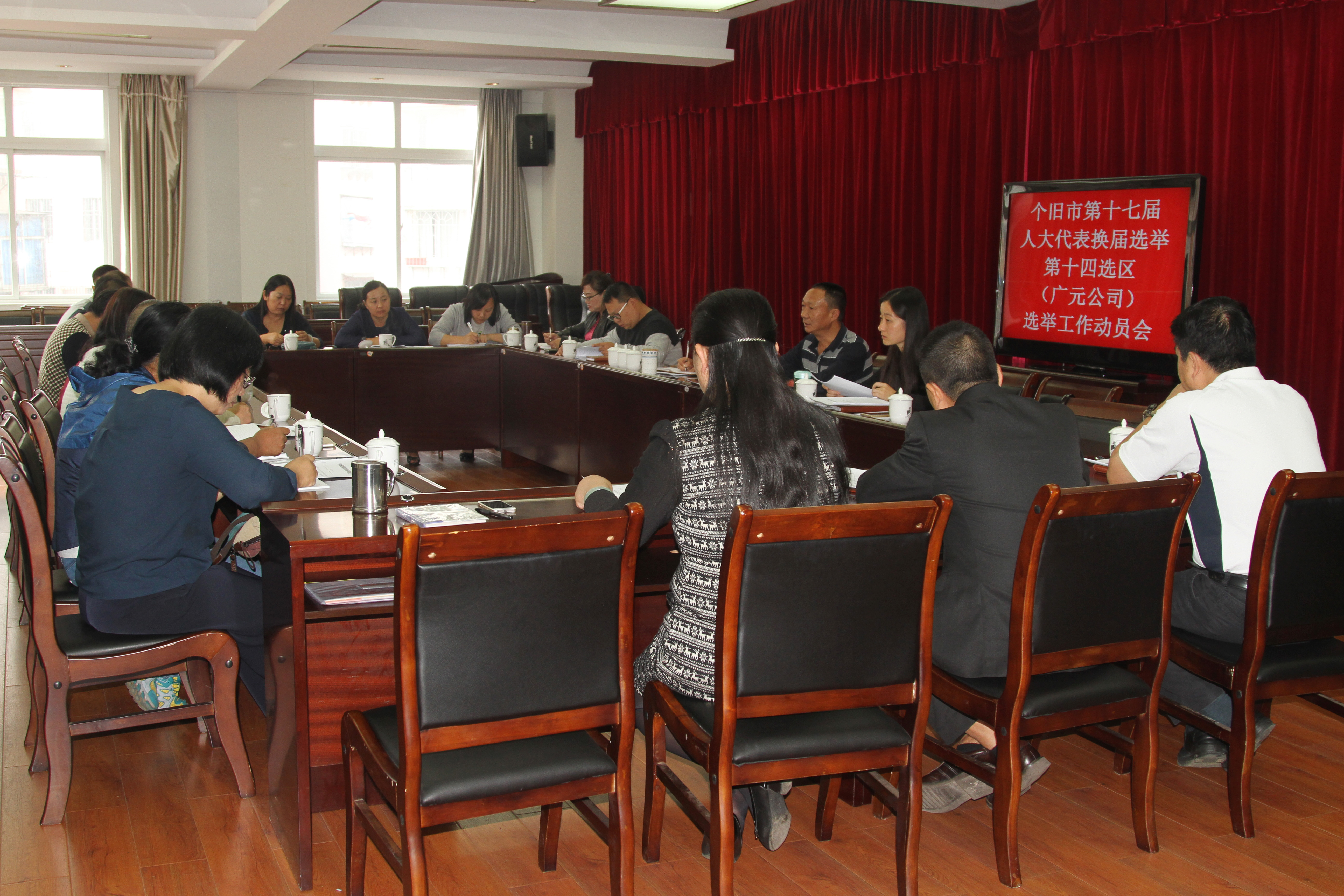 10月13日,广元公司召开个旧市第十七届人大代表换届选举第十四选区选举工作动员会。会议由公司党委副书记、工会主席刘国平主持。公司所属单位党总支书记、支部书记、部门工会主席、机关部门负责人共23人参加会议。