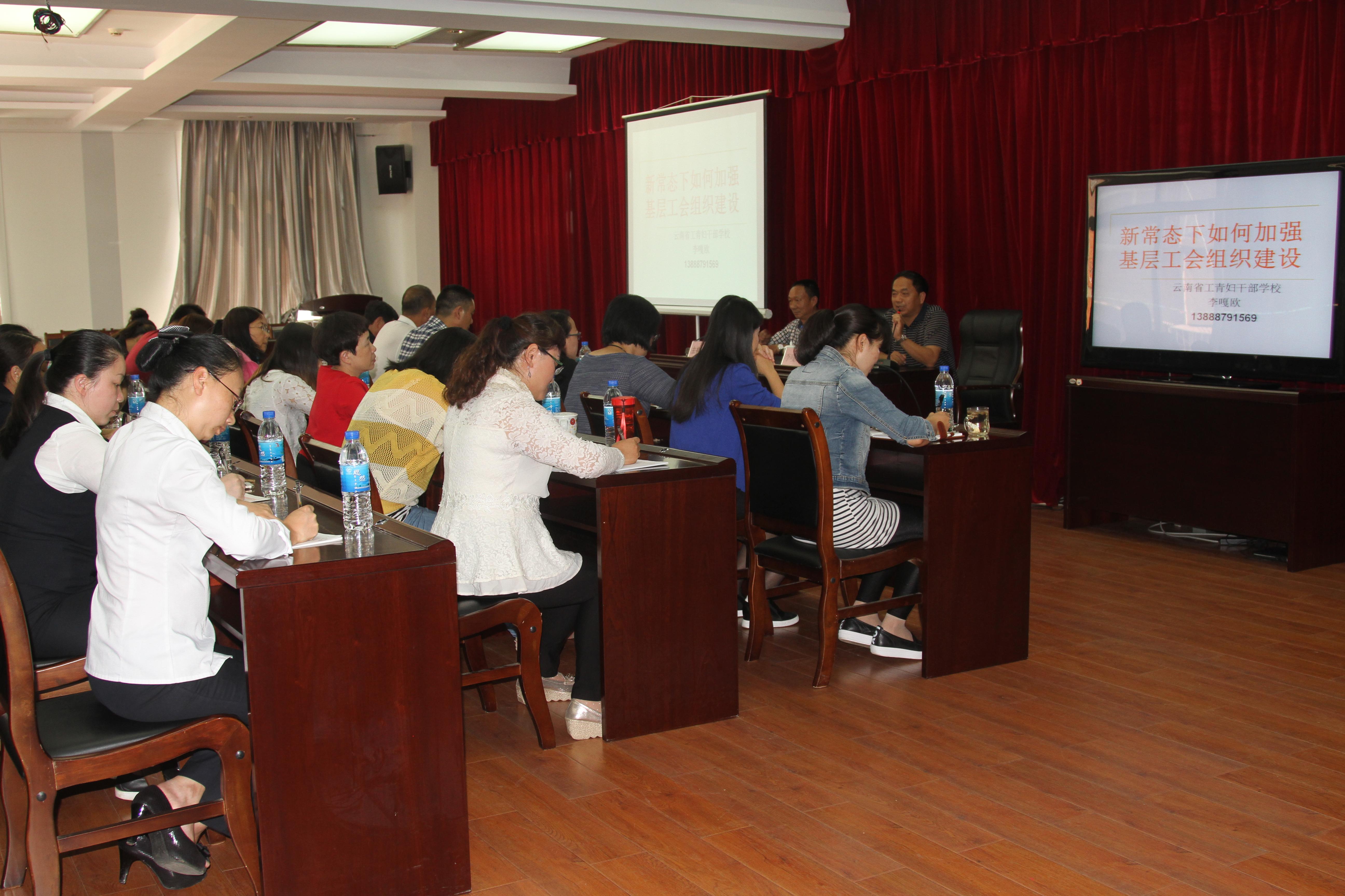 本次培训邀请到云南省工青妇干部学校工会培训部主任李嘎欧进行授课。李老师围绕新常态下做好工会组织建设的意义,工会组织和工会干部的保障,新常态下工会组建的内容和要求等三大主要内容进行讲授。他谈到,加强工会组织工作是巩固党执政的阶级基础和群众基础的必然要求;是时代发展的需要;是推进国家治理体系和治理能力现代化的必然要求;是广大职工的期盼;是工会自身发展的需要。基层工会要明确五大任务,即:教育引导职工;推动改革发展;履行维权职能;协调劳动关系;服务职工群众。要通过改革发展、深入基层、服务职工、创新工作,从而努力做到“六有工会”:有依法选举的工会主席;有独立健全的组织机构;有服务职工的活动载体;有健全完善的制度机制;有自主管理的工会经费;有会员满意的工作绩效。