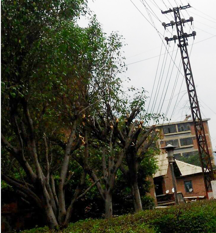 近期由于降水较多,广元公司东方红锌业小区家属区树木生长较快,为防患于未然,东方红锌业物管及时对可能会碰到、搭上高压电线,从而造成短路的树木进行排查。同时,组织工作人员利用修枝剪、修枝锯、扶梯等工具,对树木进行了全面修剪、抹头,排除了安全隐患。