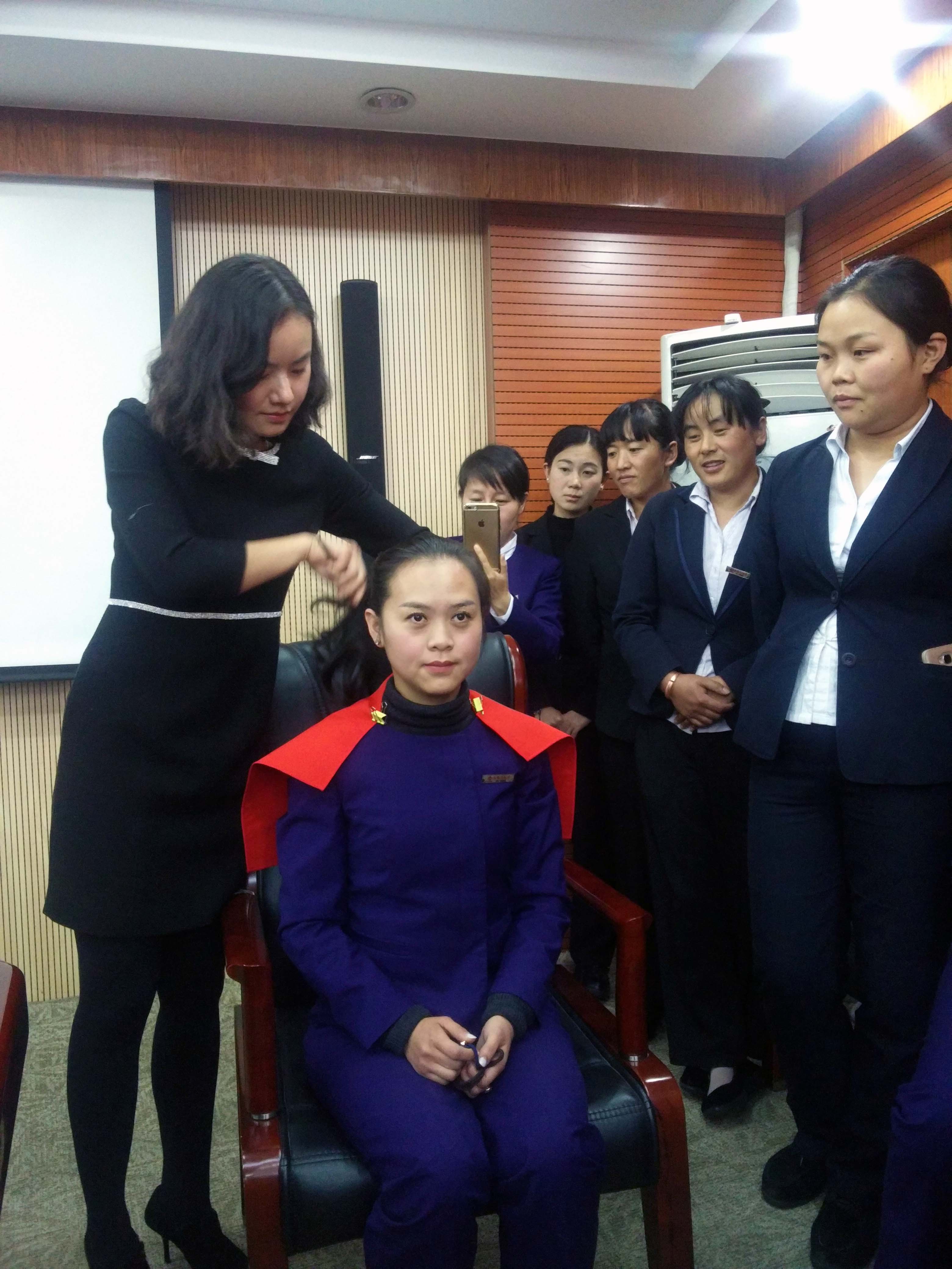 马老师结合服务行业的工作特点,综合礼貌用语、仪容仪表规范,对酒店服务工作中的服务流程、礼仪要点等内容向大家作了详细讲解。同时,向大家讲授并演示了化妆、盘发等技能。