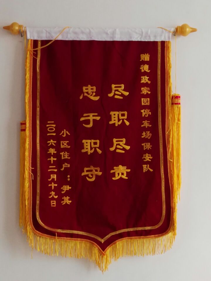 德政家园保安人员尽职尽责、忠于职守的职业操守使小区住户的利益得到了保障,让尹先生一家十分感动,特意向小区停车场保安队送上锦旗表达最诚挚的谢意。