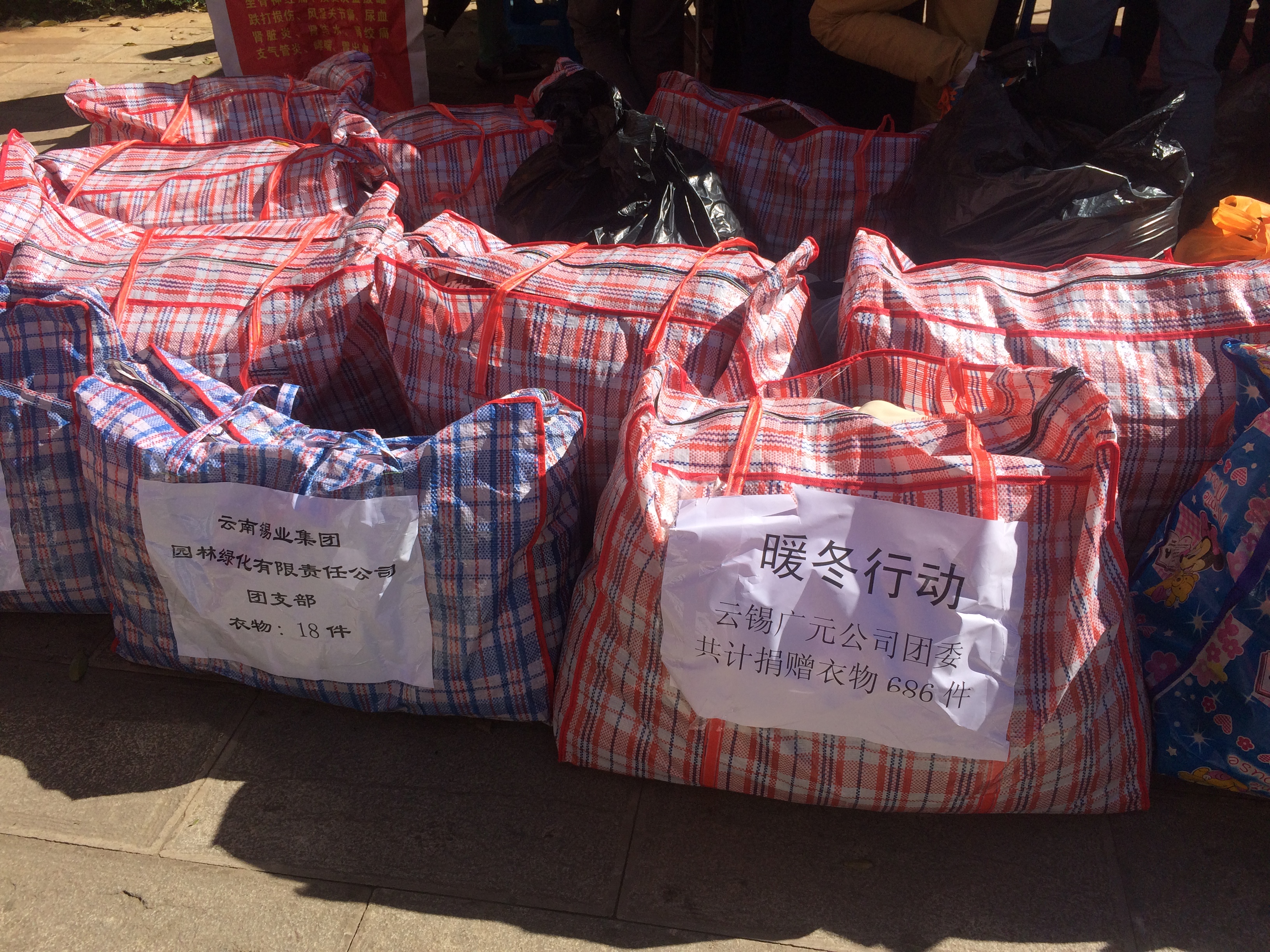 11月16日,广元公司团委发出学雷锋“暖冬行动”倡议书,号召全司团员青年收拾整理出置于箱底、无处安放的衣物,去温暖需要帮助的人们。倡议发出后,公司各团支部纷纷响应,立即组织青年积极行动起来。截止11月19日,共计捐赠衣物686件,广元公司团委将爱心衣物打包送到个旧市学雷锋爱心送温暖活动现场,并参加了当天的活动。