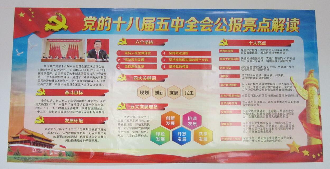 展板内容包括十八届五中全会的奋斗目标、 “六个坚持”、“四大关键词”、“五大发展理念” “十大亮点新政策” 及中国共产党廉洁自律准则等;悬挂的标语为“创新、协调、绿色、开放、共享五大发展理念”;在走道上粘贴的省委九届十二次全会公报,详细呈现了省委关于制定“十三五”规划的相关建议和举措。