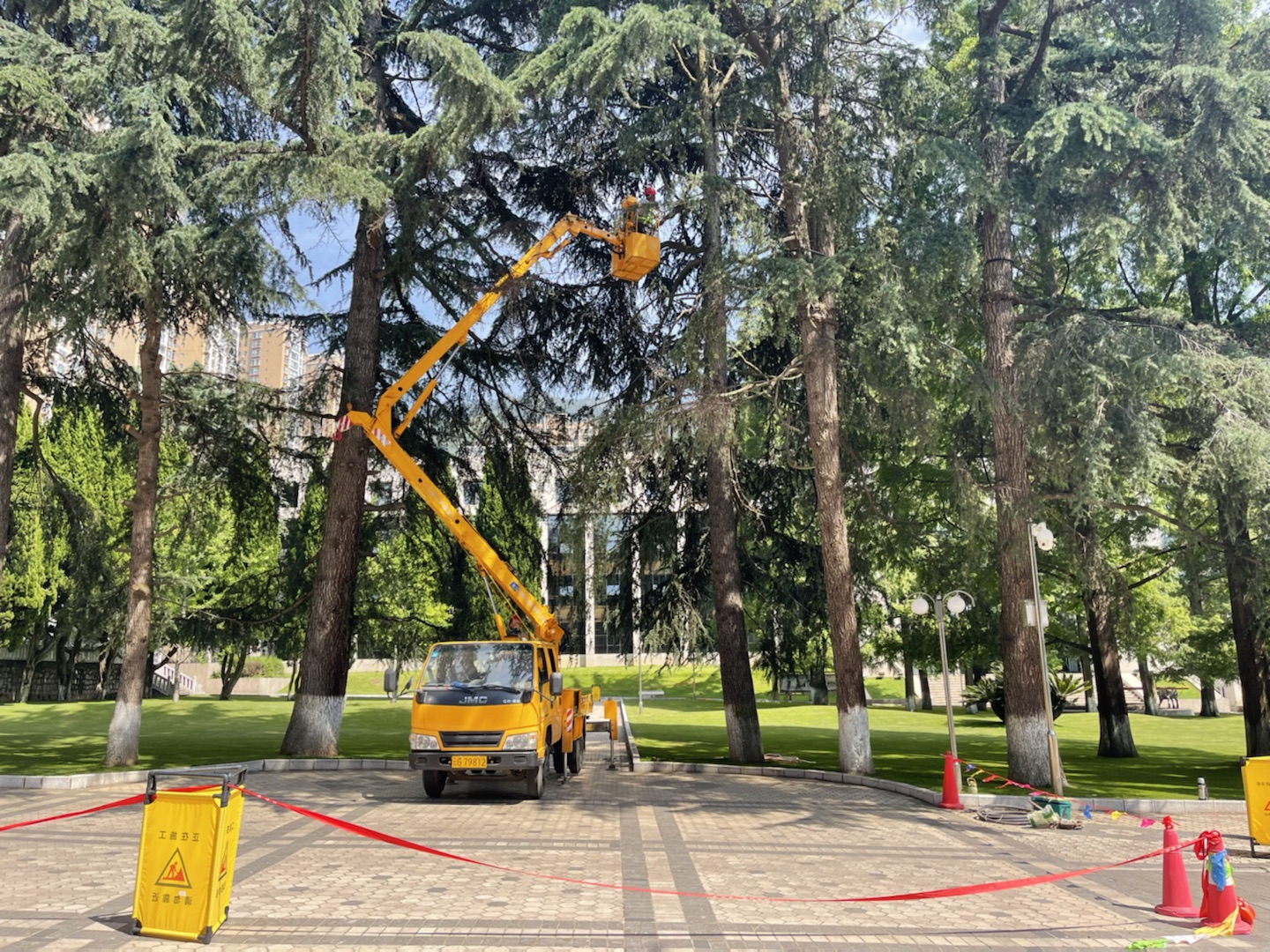“三分栽、七分养”是园林工程成就美观的工作法则。云锡公司大院内的部分雪松由于种植种年限较长,相继出现了树杆倾斜的情况,园林项目部人员采取拉力平衡的方式,将倾斜雪松进行拉稳固定,有效消除了树木翻根倾倒的安全隐患。锡业分公司厂区内的霸王棕生长过密,部分老旧枝条形状杂乱,在影响美观的同时存在着安全隐患,项目部迅速组织人员采用登高车对老旧枝叶进行修剪整理,及时消除安全隐患,得到了锡业分公司的好评。