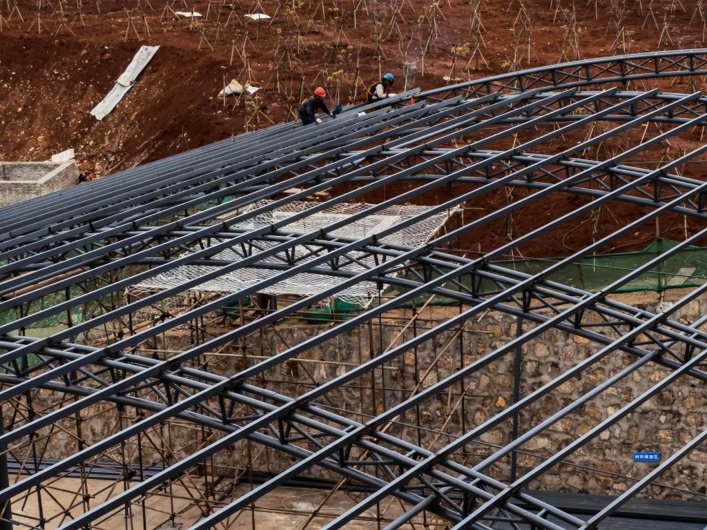 在老厂分公司羊坝底选矿车间锡石浮选锡精矿堆场项目现场,面对高空作业难度大,职工们严格按照要求在作业面下方铺设防坠网,作业人员穿戴双钩安全带,现场专人监护,齐心协力配合吊装横梁,一根一根、一尺一寸、胆大心细的展现着艰辛和不易。