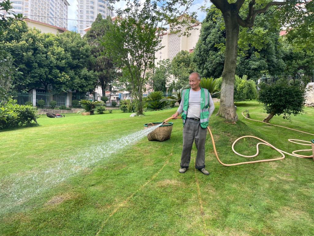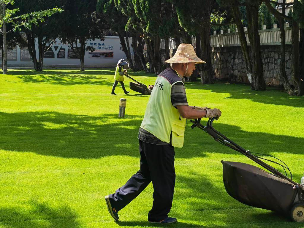 用心用情护绿荫。内行人都知道园林工程是“三分栽七分养”,后期的养护才是成就美景的关键。云锡机关大院的草坪作为云锡公司的“门面”,自2002年完工至今已近20年草龄,逐步进入草坪老化期,养护难度不断增大,稍微有一丝的懈怠,就会造成草坪的大面积死亡,影响美观的同时也增加了养护成本,为此,赵师傅带领着大家坚持每季度1次的梳草,每月2次的剪草,遇到气温较高时,频率还会更高,有时甚至1周一次,面对繁琐的草坪修剪,赵师傅总会笑呵呵地说:“这四块草坪,得像照顾婴儿一样呵护,一不留神就给毁了!这些年的工作,我体会到了,养好的关键在于一个‘勤’字,归纳下来就是做好腿勤、脑勤、手勤、眼勤”。有时怕修剪时的声音过大影响会议的正常召开,赵师傅会提前与相关人员进行对接,错开会议时间,利用周末加班来进行修剪成了他的“家常便饭”。虽然工作辛苦,但每当听到有人赞美草坪时,他认为所有的付出都是值得的。