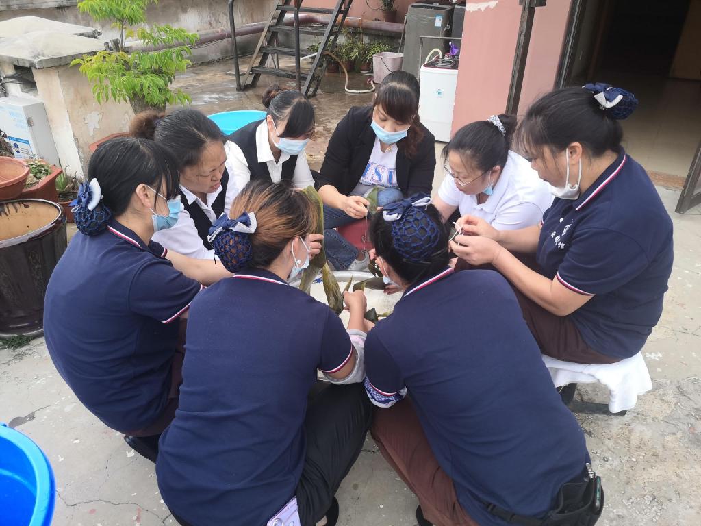 云锡宾馆部门工会组织职工围在一起包粽子,填糯米、放配料、裹叶子、扎线……一双双巧手在欢声笑语中上下翻飞,很快一个个漂亮的三角粽子就在大家的手中诞生了。