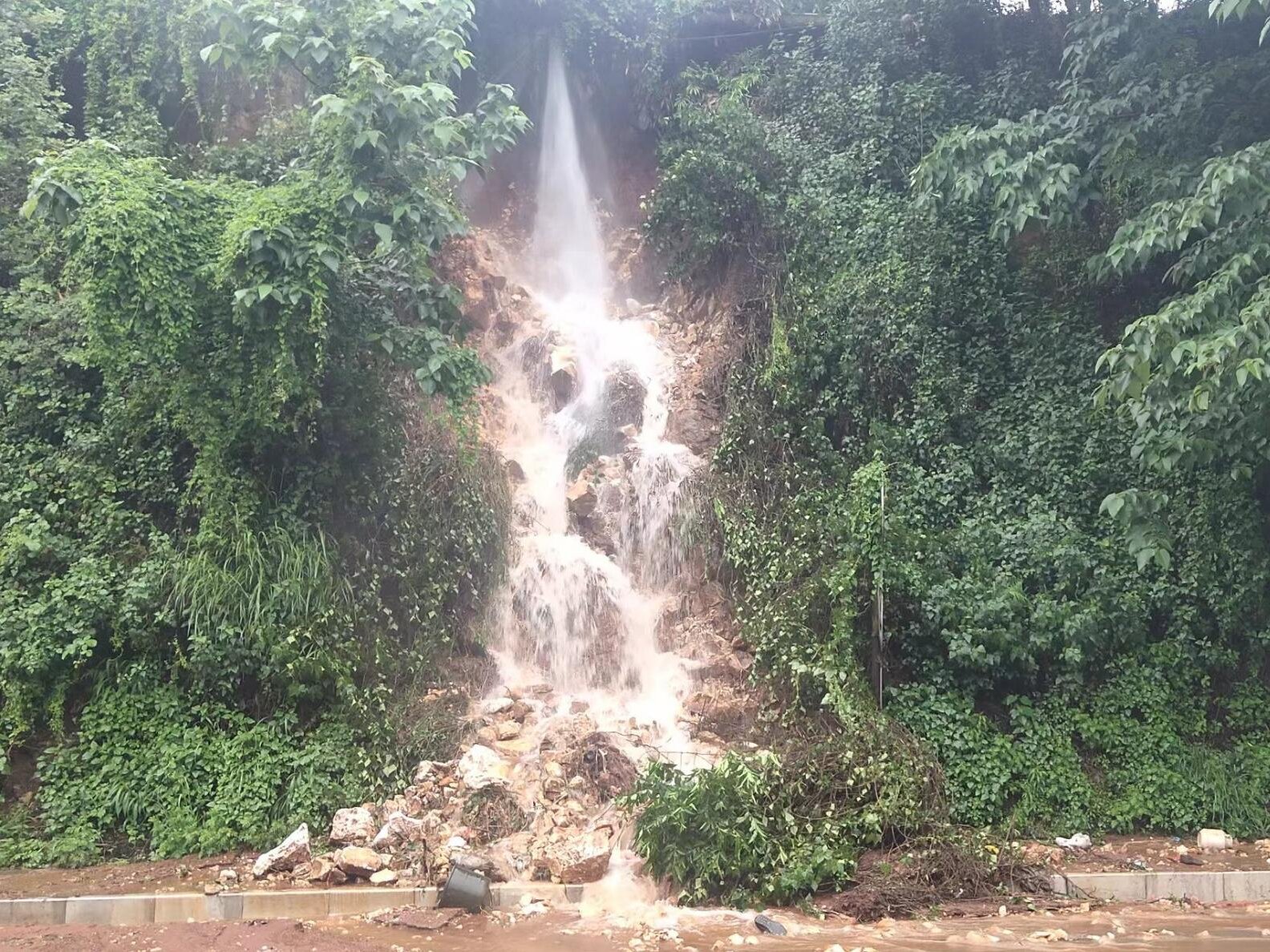 近日,供水公司接到电话,国防公路发生爆管,泥土碎石滑落路面。