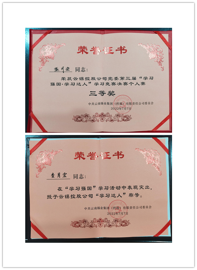 7 月 7 日下午,第三届云锡控股公司“学习强国 学习达人”学习竞赛决赛在锡业分公司办公区 1 幢 3 楼报告厅举行,来自供水二分公司的职工查月宏荣获得个人赛三等奖及2022年度控股公司“学习达人”称号。