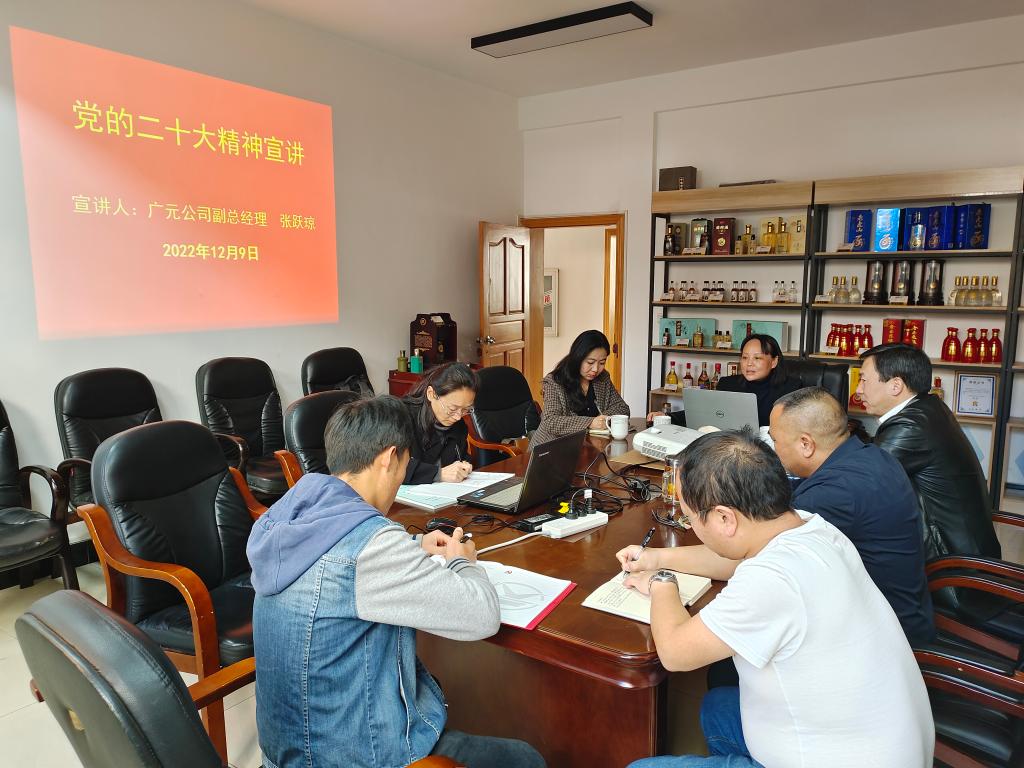 广元公司副总经理张跃琼紧紧围绕党的二十大主题及其主要成果、过去五年的工作和新时代十年的伟大变革、马克思主义中国化时代化、中国式现代化、全面建设社会主义现代化、坚持党的全面领导和全面从严治党、面对的风险挑战七个方面,结合酒业公司实践情况,对党的二十大精神进宣讲。