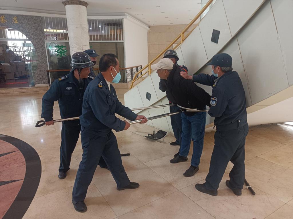 演练以宾馆一楼大堂发生“歹徒”暴力袭击为假设事件,宾馆保卫部员工接到报警后,立即启动反恐防暴应急预案,赶往现场与恐怖分子展开激烈对抗,随即手持钢叉、警棍包围“歹徒”并将其制服。