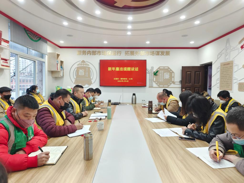 1月3日,云建安(园林绿化)公司召开管理人员大会,开展新年廉洁集体提醒谈话,叮嘱重点岗位人员严守廉洁自律思想防线,增强防范“被围猎”意识,清白履职、干净做事,敲响警钟,筑牢“三不腐”基础。