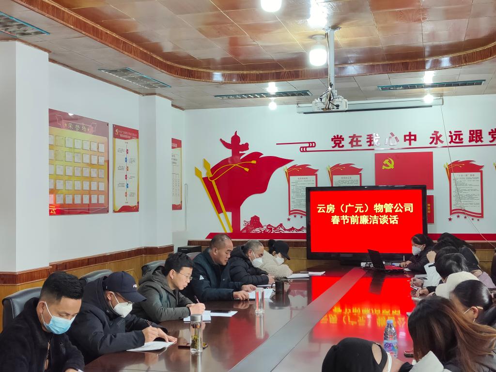 1月18日,广元物管公司党总支开展春节节前廉洁谈话,进一步强化政治意识和政治规矩,教育引导党员干部职工持之以恒正风肃纪。党总支书记罗腾主持廉洁谈话。