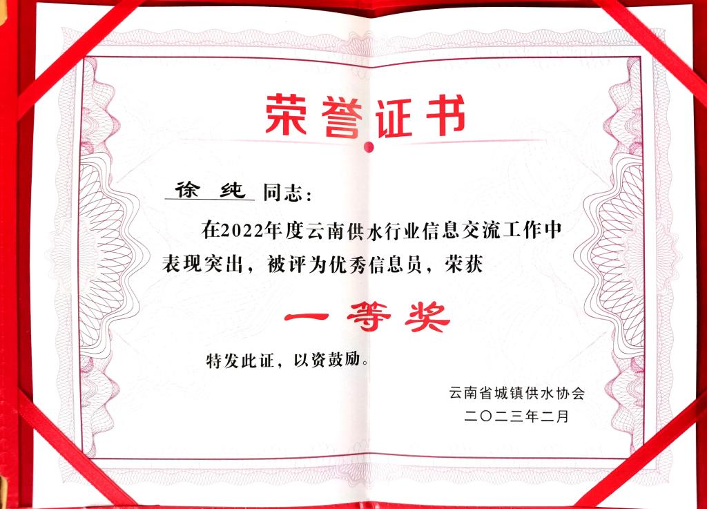 据了解,云南省城镇供水协会以党建为引领,充分发挥一刊一网一公众号宣传平台作用,积极宣传报道云南供水行业喜迎二十大和学习贯彻二十大精神系列活动,反映各单位为群众按事实、守护民生工程等信息。92家会员单位403名信息员投稿1459篇,并根据稿源质量和信息发布数量进行评选,最终产生了信息工作先进单位9家,信息工作先进个人一等奖7名,二等奖12名,三等奖21名。供水公司职工徐纯被评为优秀信息员,荣获一等奖。
