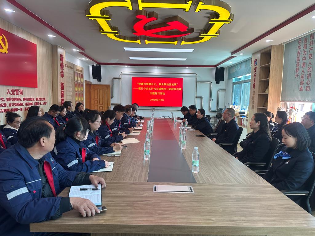 为深化党建引领作用,搭建银企沟通合作桥梁,2月2日,云锡供水公司与个旧建设银行以“党建引领聚合力,银企联动促发展”为主题开展联学共建主题党日活动。