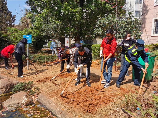 党史学习教育动员部署结束后,与会党员与部分入党积极分子来到云锡花园小区三期景观水池旁开展党员义务劳动,用实际行动落实党史学习教育要求。鲜艳的党旗下,大家分工合作,有的用竹网打捞水池中青苔和杂物,有的用锄头为要更换绿植的绿化带松土,有的清理着水池周边的垃圾和杂草。尽管当天烈日当空,每个人都是满头大汗,但大家的劳动热情丝毫未减,忙的不亦乐乎。经过两个多小时的辛勤劳动,水池周边的面貌焕然一新,路过的住户群众纷纷点赞。(沈 健)
