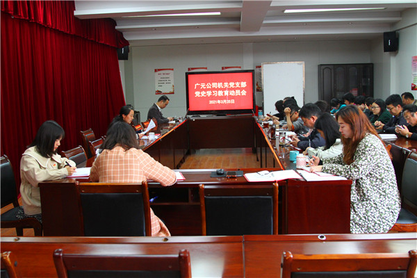 3月25日下午,广元机关党支部召开党史学习教育动员大会。与会党员集体学习了习近平总书记在党史学习动员大会上的重要讲话,进一步明确了开展党史学习教育活动的重大意义,并认真贯彻落实广元公司党委关于党史学习教育的具体要求,对机关党支部开展党史学习教育进行动员部署。党支部书记樊艳琼主持会议并作动员讲话。