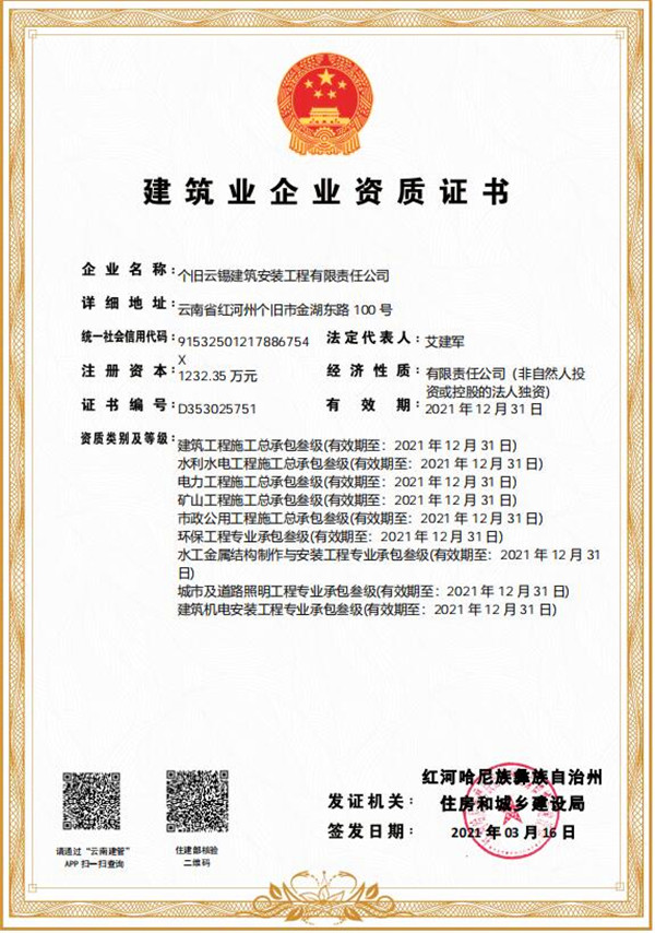 3月16日,经红河州住房和城乡建设局审查核准,云建安公司新申报环保工程专业承包叁级资质顺利获批,并已取得新的资质证书,这是云建安公司继增项“矿山工程、电力工程”总承包资质后的又一新的突破。