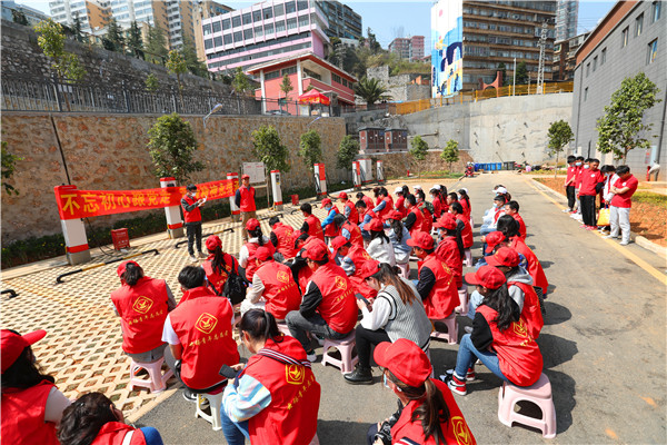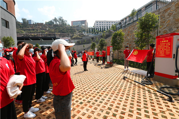活动开始,团员青年饱含激情重温入团誓词。随后,集中学习了习近平总书记在党史学习教育动员大会上的重要讲话,并由每个单位的一名团员青年代表讲述分享一段党史小故事。分享结束后,各单位青年团员志愿者分为两个小组,统一着志愿者服装,佩戴党徽、团徽分别来到新冠商城和金盆小区为广大职工群众提供志愿服务。