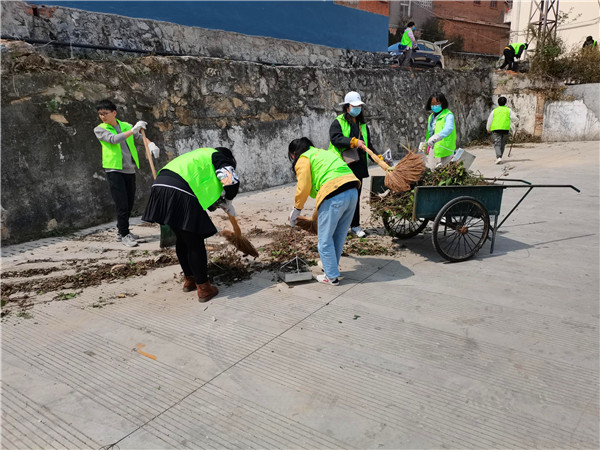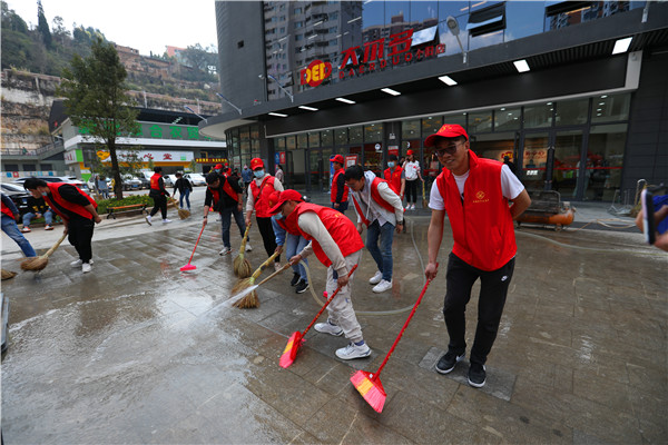 在新冠商城大尔多超市门前,志愿者们拿起扫把、拖把,用水龙头把这块场地冲得干干净净;在二楼的儿童乐园、电影院,志愿者拿着抹布仔仔细细地把各个角落的椅子、游乐设施抹得锃光瓦亮;在金盆小区,志愿者们扛起锄头、铁锹,认真清理各类杂草,虽然初春的和风仍有几分寒冷,但大家热情似火,除草、扫地、运垃圾,齐心协力把满是杂草的挡墙打理得清清爽爽。