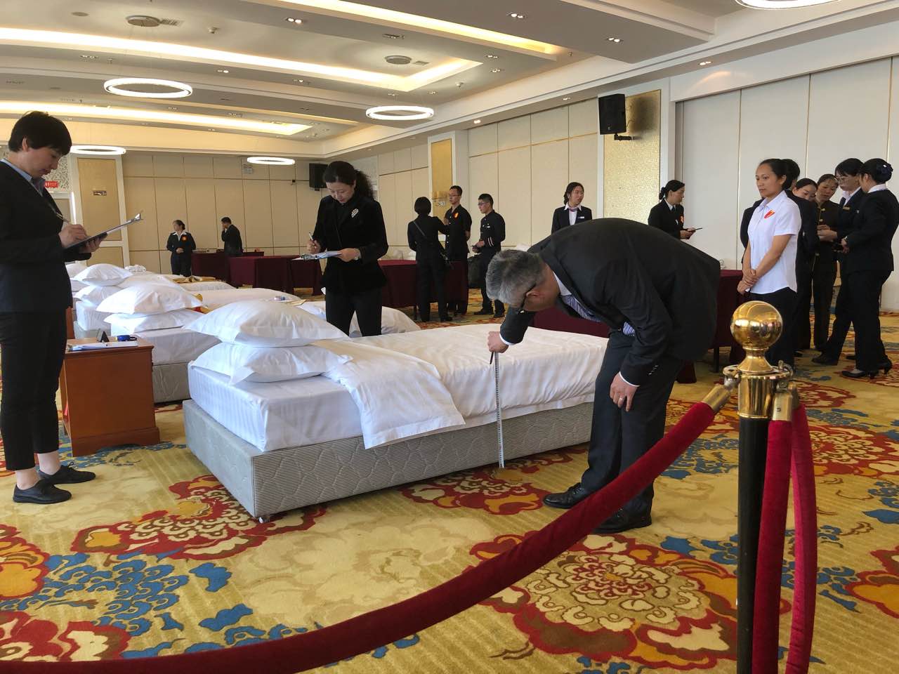 云锡大酒店派出两名客房服务员参加客房中式铺床技能竞赛。该项目要求在7分钟内完成2张中式铺床,评分内容包含仪容仪表、铺床标准、夜床创意。两名选手用娴熟的动作逐一完成了甩单、定位、包角、套被子、枕芯等铺床操作,将一套规范标准美观的床铺展现在大家面前,充分展现了云锡大酒店的服务质素。同时夜床服务用品美观新颖极具个性化,引得观赛人员纷纷观摩拍照。