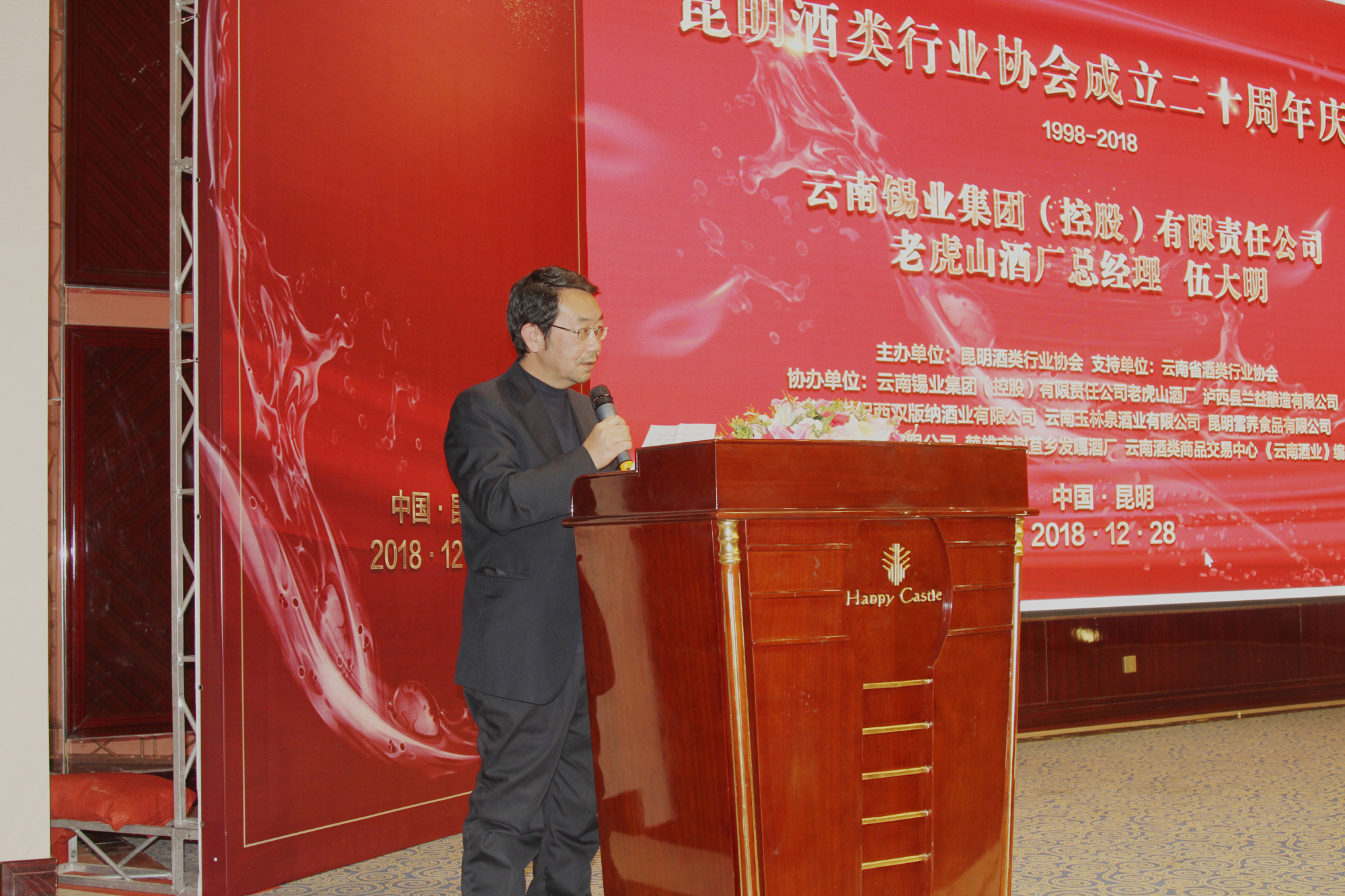 在昆明酒类行业协会成立二十周年之际,作为云南省唯一一家国有酒类生产企业和小曲清香型白酒重点骨干企业,老虎山酒厂应邀参加了该协会二十周年庆典。庆典活动上,云锡老虎山酒业总经理伍大明代表云南省酒类生产企业为庆典活动致辞,介绍了云锡老虎山酒业发展概况,回顾了与昆明酒类行业协会风雨同舟、互相扶持、共同发展的深厚情谊,表达了未来将与昆明酒类行业协会和全省酒业同行携手共进、共同振兴云南酒业的美好愿景。
