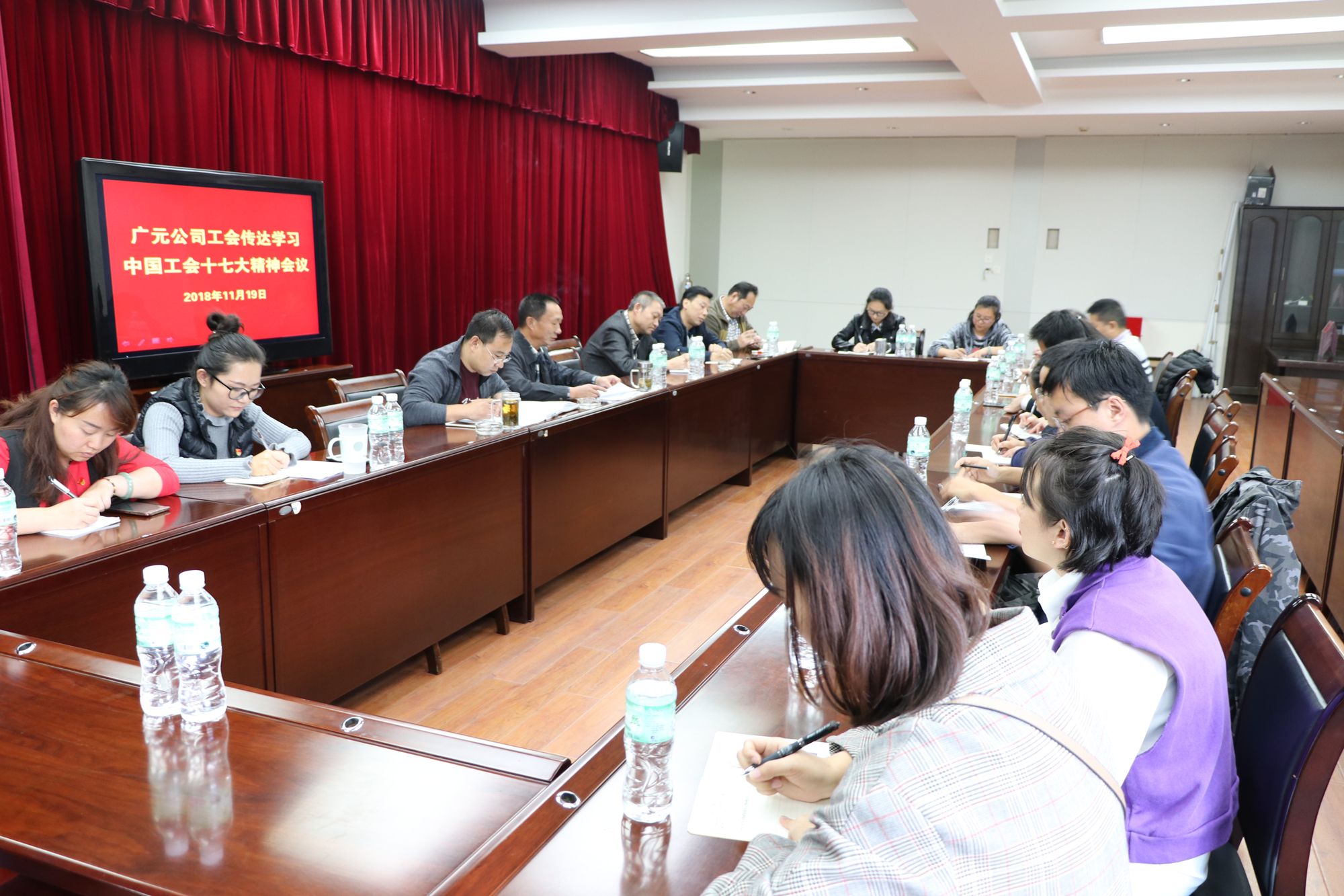 11月19日,广元公司召开专题会议,传达学习贯彻中国工会第十七次全国代表大会精神,公司群团工作人员23人参加会议。