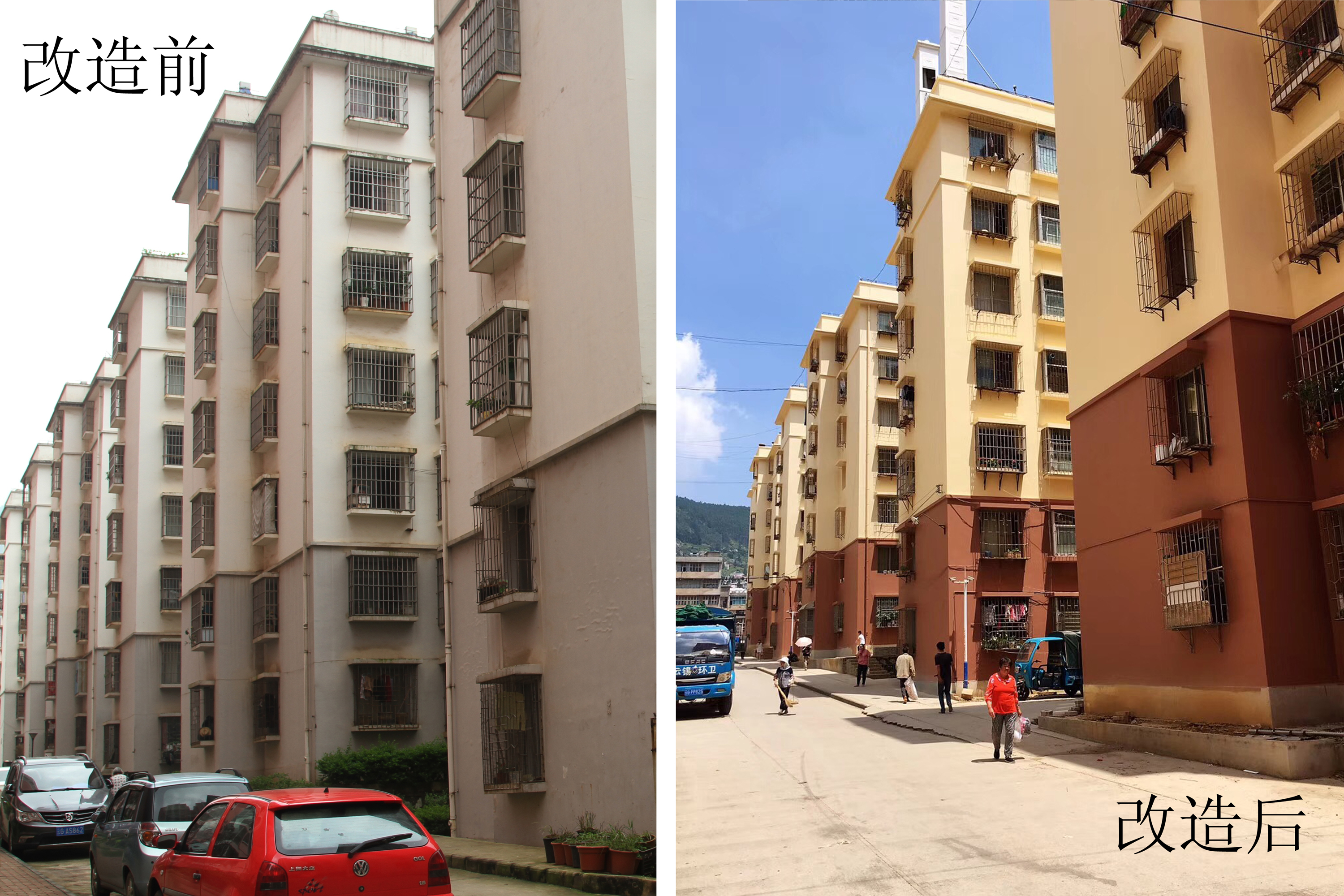 德政家园小区和谐里是云锡建设的第一批廉租房,由于房龄接近10年,墙面老化脱落。此次“三供一业”项目中,负责该小区施工的三标段管理人员以前期改造完成的样板房为参照,结合实际进一步修改完善设计方案,积极征求物管单位和小区住户意见,合理选定外墙漆,严格规范外置管线布置,经过4个月的努力,让整个小区面貌焕然一新,随着下一步公共设施的建设和修缮,整个小区居住环境将迎来新的模样。