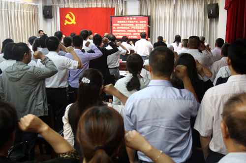 大会在庄严的《国歌》声中拉开序幕,全体党员起立,举起右臂面对鲜红的党旗重温入党誓词宣誓。然后,纪委书记张跃琼同志宣读广元公司党委《关于“七一”表彰奖励先进党支部、优秀党支部书记、优秀党务工作者和优秀共产党员的决定》,在主席台就座的领导班子成员对2012年以来涌现出来的先进基层党组织、优秀共产党员、优秀党支部书记、优秀党务工作者进行表彰。接着,总经理许祖英对广元公司深改攻坚工作进行安排部署并与各单位签订深改攻坚责任书。