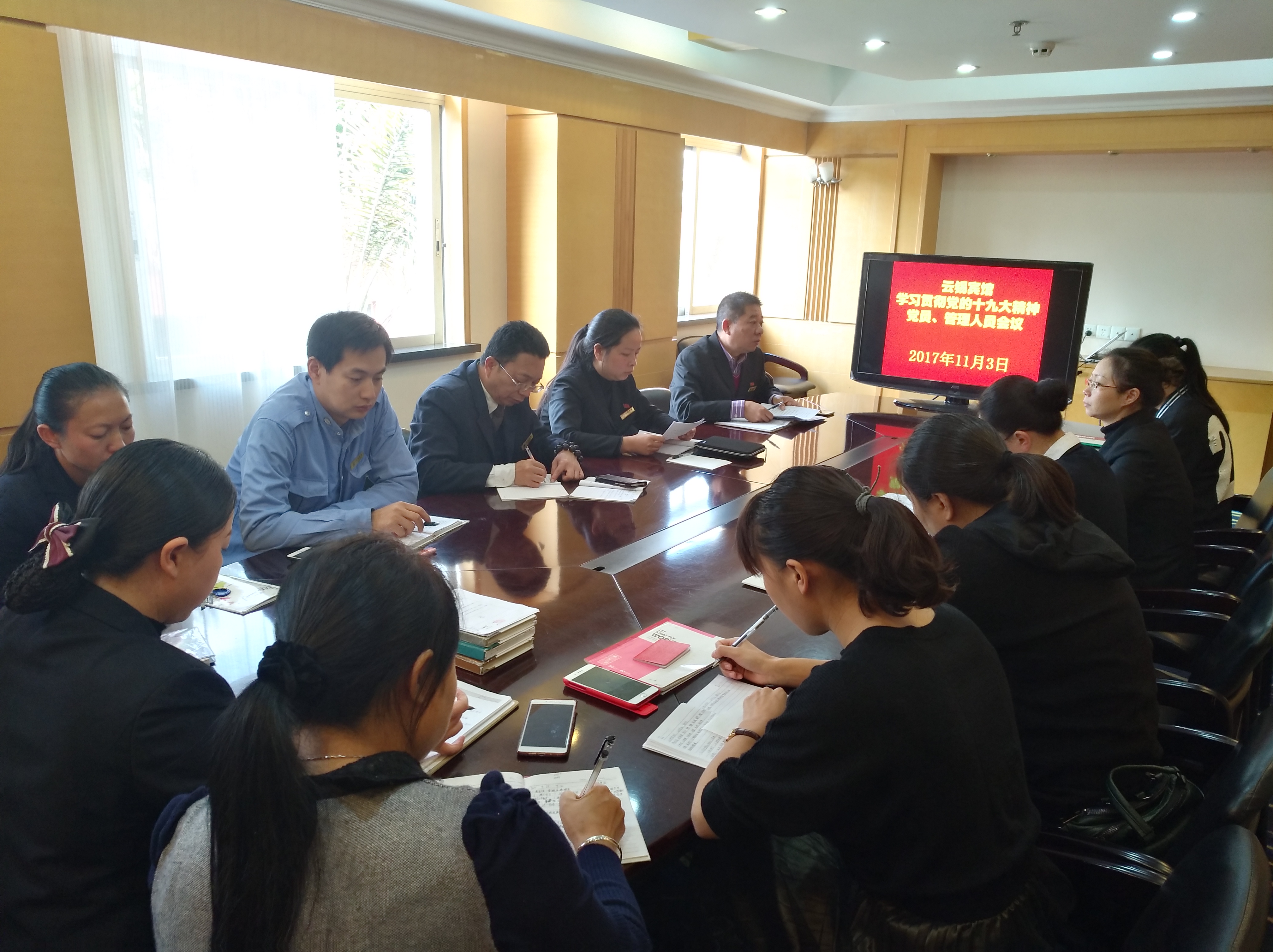 11月3日,云锡宾馆召开党员及管理人员会议,传达学习党的十九大精神和学习控股公司党委书记张涛署名文章《不忘初心、砥砺奋进、牢记使命、坚毅勇为,努力建设具有重要影响力的国际化现代企业集团》内容。