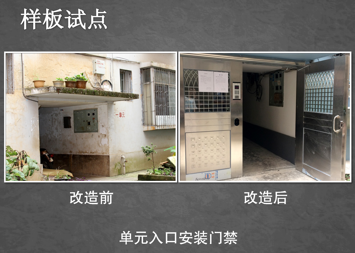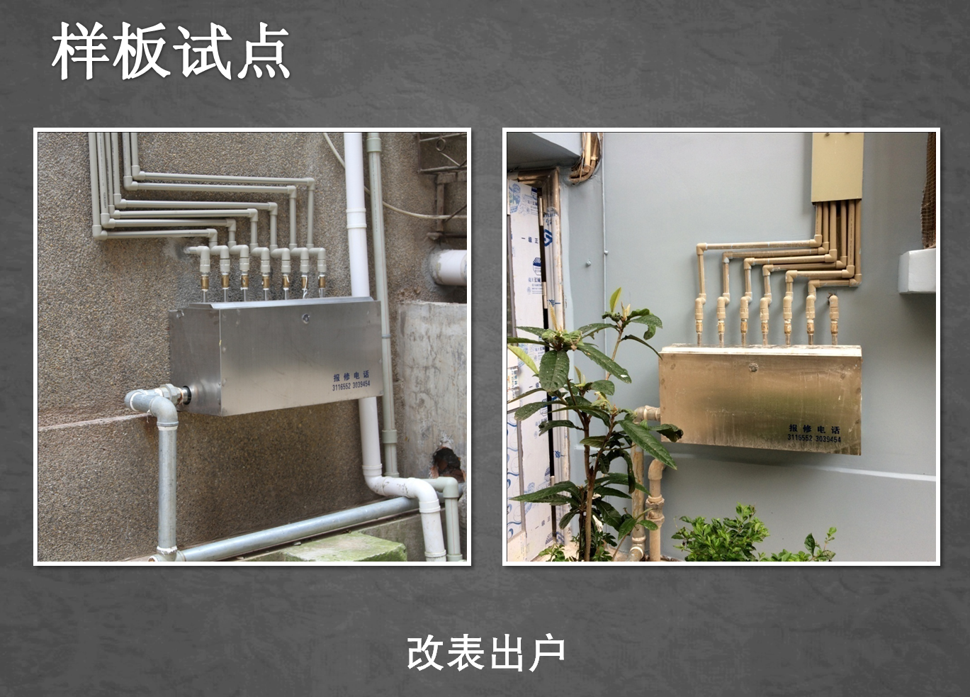 为了稳步推进云锡“三供一业”维修改造工作,广元公司把德政家园和谐里7幢、翠鸣里21幢、德政一期21幢作为样板试点,主要就水电表出户、单元防盗门安装、屋面防水、外墙粉刷进行维修改造。目前,样板试点工程已顺利完工,成为德政小区一道亮丽的风景线。