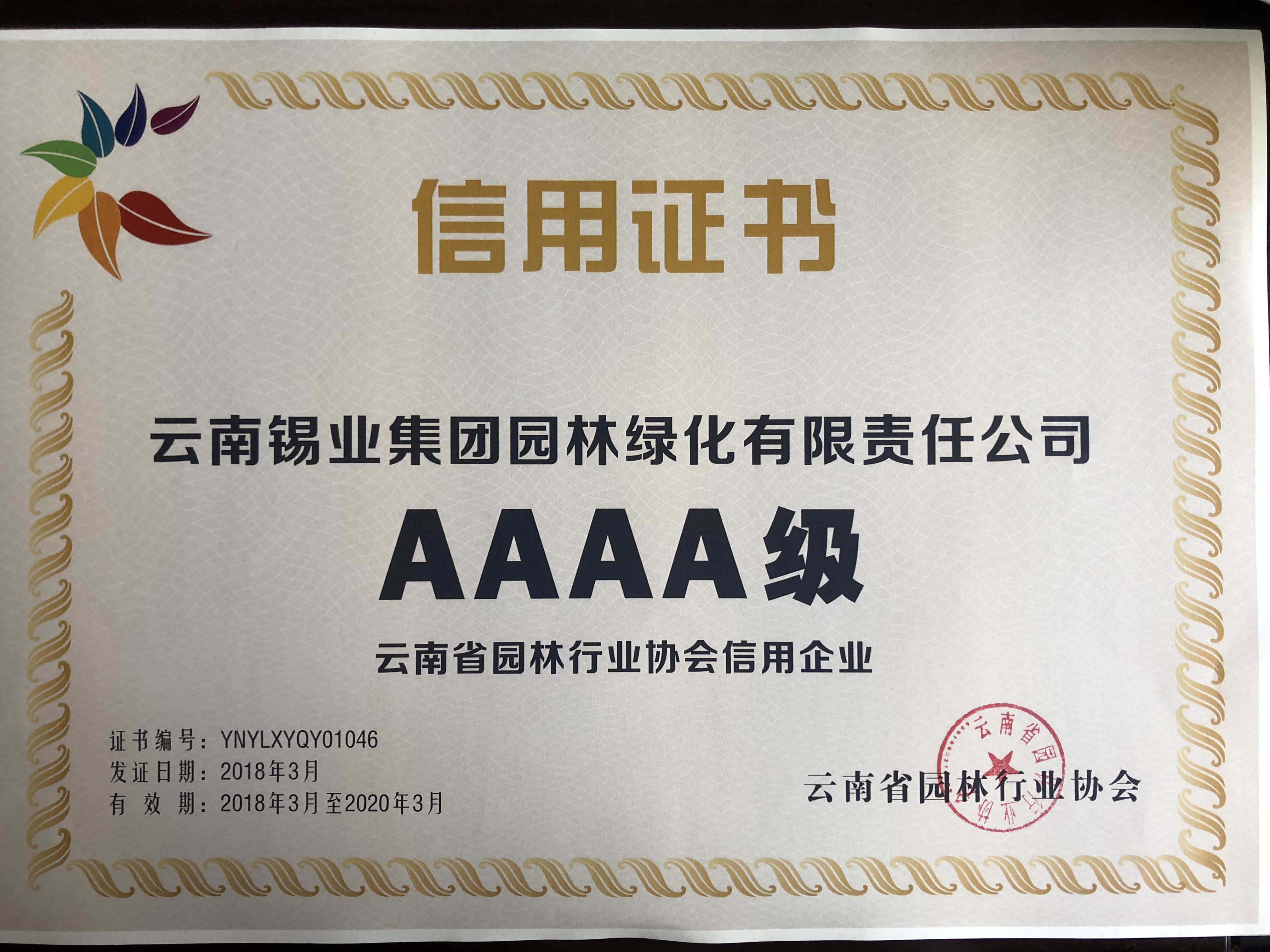 近日,广元园林绿化公司获得“云南省园林行业协会信用AAAA级企业”殊荣。
