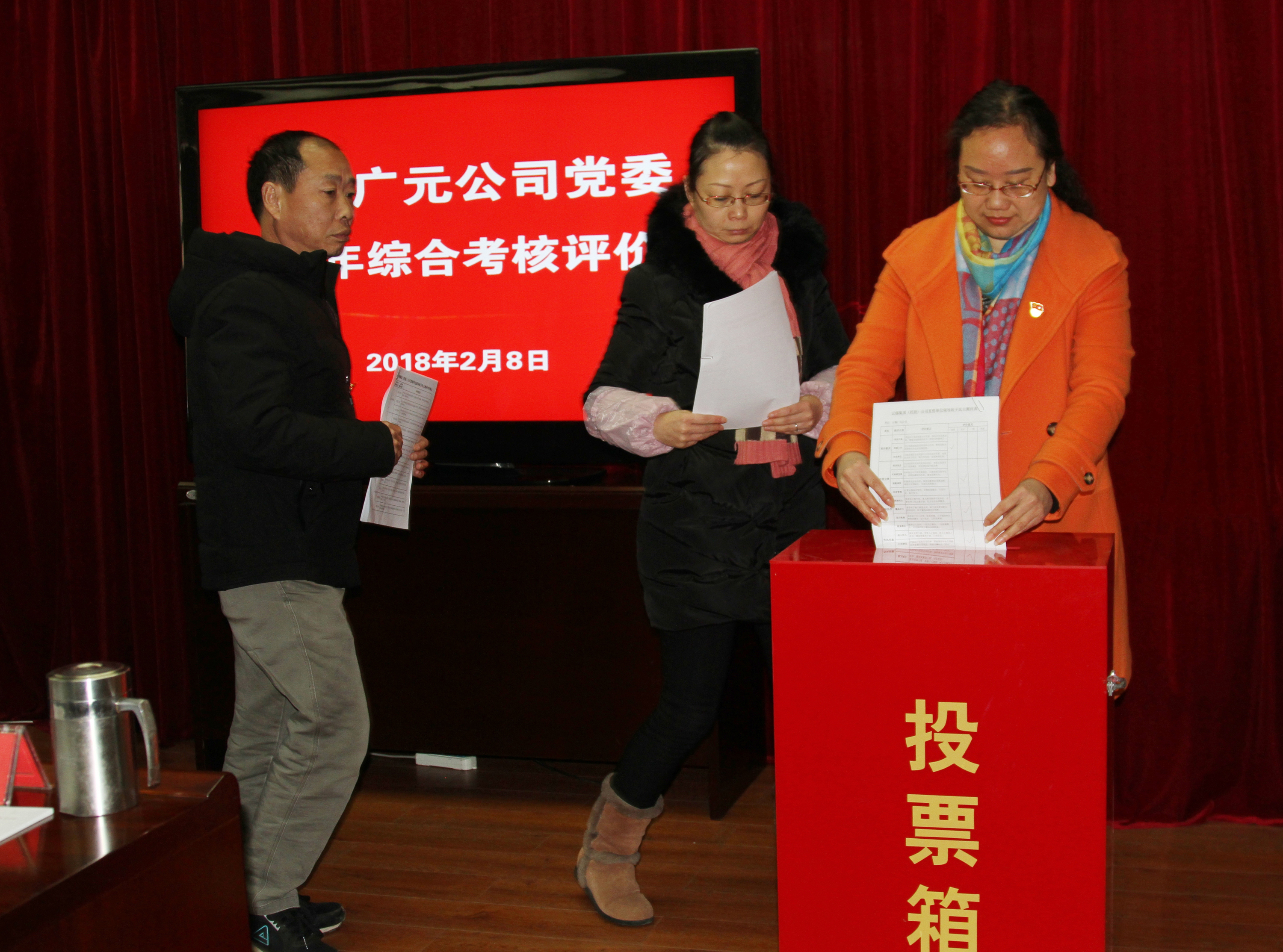 考评会上,许祖英代表广元公司领导班子作2017年度党政领导班子工作报告,汇报2017年度生产经营情况、党建工作责任制落实情况、党风廉政建设责任制落实情况、深改攻坚责任完成情况以及干部选拔任用情况。与会人员对领导班子和班子成员进行了民主测评,民主推荐了后备干部。