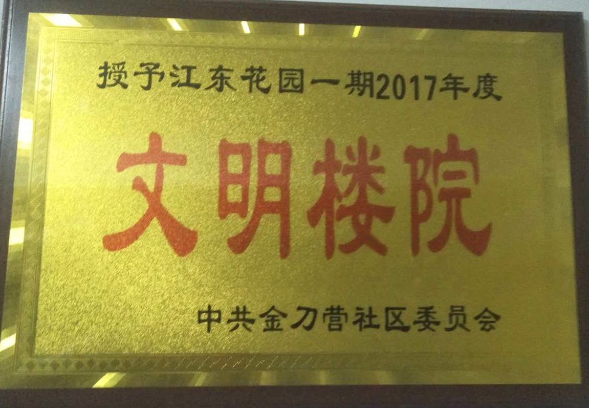 近日,昆物管公司所辖江东花园小区被昆明金刀营社区授予2017年度“文明楼院”的光荣称号。