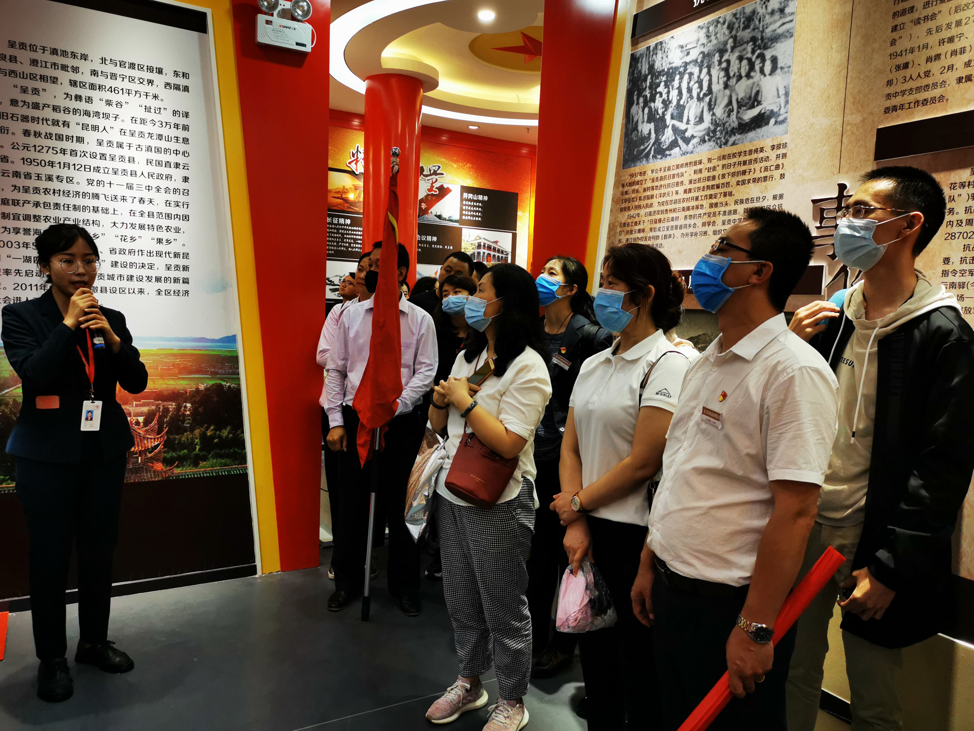 此次活动,主要以公园中体现的历史为脉络,由点及线、由线及面,以呈贡革命烈士纪念碑为基础,科学布局党史雕塑群、初心广场、党建文化展厅、党群活动室等主体单元;综合运用雕塑、图板、多媒体等多种形式,生动再现党领导人民进行新民主主义革命进而建立新中国的丰功伟绩;生动再现呈贡人民在党的领导下谋求解放的历史进程;生动再现罗彩、张天虚等革命先烈和仁人志士的英雄事迹;面对着鲜红的党旗下,党员们握紧拳头举起右手重温入党誓词,激励人们不忘初心,继续前行。