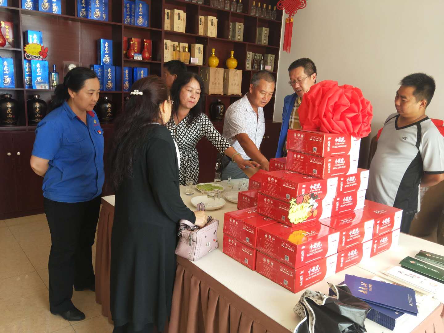 在酒厂门口的销售门市,专业销售人员向其介绍了老虎山酒厂生产的各类特色酒品,来访人员饶有兴趣地听工作人员介绍,仔细查看相关资料,相互交流探讨,并品尝了不同的系列酒产品。