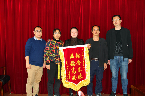 2月26日是正月十五元宵节。当天下午,一面绣着“拾金不昧、品德高尚”的大红锦旗和感谢信,由吴成兵、李外琼夫妇亲手送到了广元公司党委办公室。