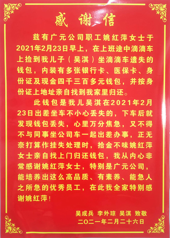 面对失而复得的钱包,失主吴淇的父母吴成兵、李外琼 欣喜万分,激动之情难以言表,由于儿子吴淇当天已出差,吴成兵、李外琼表示一定要到广元公司当面向单位领导和姚红萍本人表达诚挚的谢意!