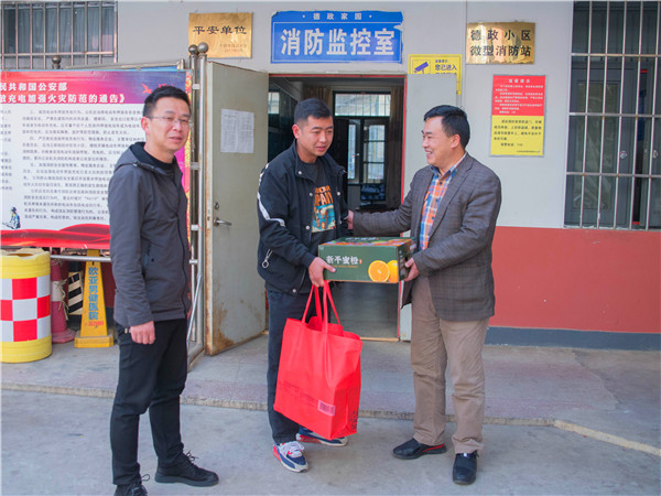 在物业辖区,马文清对各小区值班人员在春节期间坚守一线的工作精神和工作态度,给予高度肯定,并为他们的家人捎去新年的祝愿,感谢家属的支持与理解。同时强调物业值班人员一定要做好春节期间的疫情防控、安全、防火、防盗等工作,站好岗、负好责,保障春节期间辖区的平安稳定、欢乐祥和。