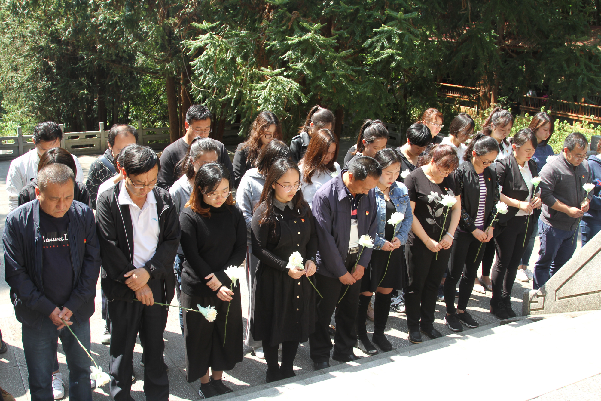 参加活动的干部职工和团干部身着素色服装,手执白色菊花,排整齐队列,来到烈士纪念碑前深切悼念革命烈士,缅怀革命先烈们的丰功伟绩,颂扬革命先烈的崇高精神,寄托哀思,激扬斗志。两名工作人员缓缓走上台阶向烈士纪念碑敬献花圈,全体人员怀着崇敬和悲痛的心情向为祖国和人民英勇献身的英烈鞠躬默哀。默哀结束后大家排成一列瞻仰了烈士纪念碑,并向烈士敬献了鲜花。