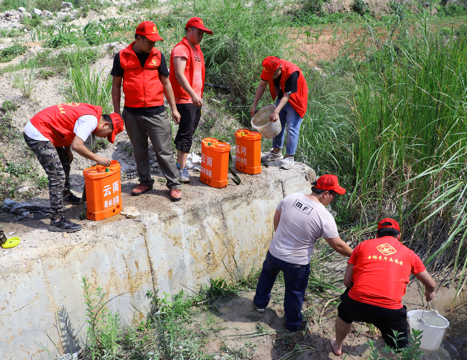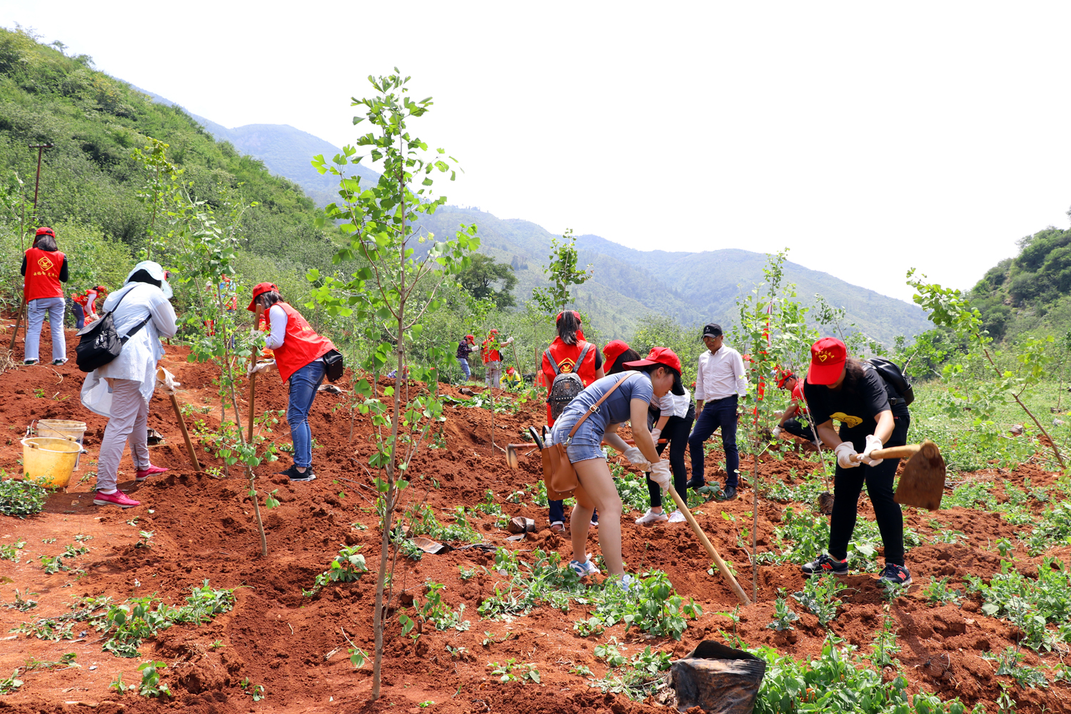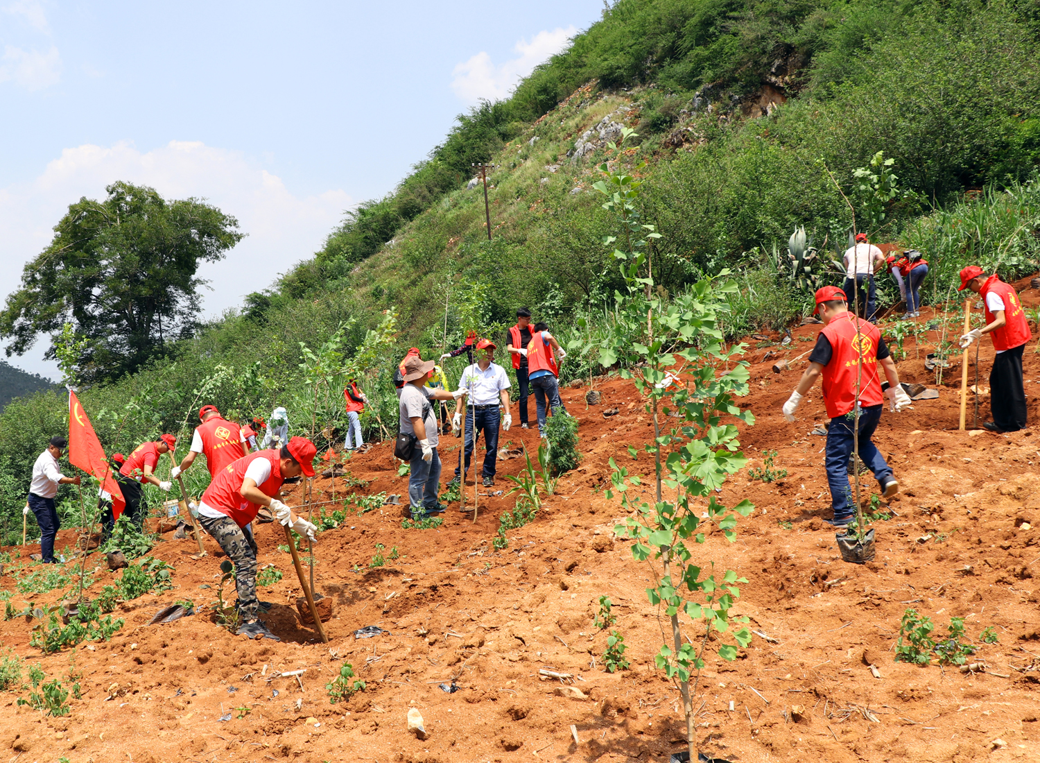 尽管这一天当地气温高达30多摄氏度,但参加活动的团员青年热情却丝毫没有受高温天气影响。他们头顶烈日,手握锄头,将由广元园林绿化公司提供的两百余株银杏树苗种植在陡峭的山坡上,让荒山披上了新绿。为了让种下的树苗能够成活,他们徒步一里多地,利用消防工具从小溪里背来一桶桶清水,用心滋润着每一株绿色的幼苗。