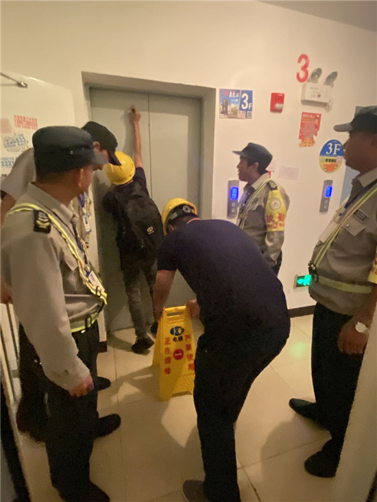 参加演练的工作人员根据之前制定的方案,进行了详细的分工部署,演练操作一气呵成。随后进行的是电梯施救现场演练,为做到理论和实践相结合,模拟了电梯困人场景的应急救援演练,安保人员发现有住户按铃报警后,及时赶到现场,轻拍电梯门与被困住户沟通、安抚,并告知其注意事项,详细了解被困人员身体情况和所处楼层的同时,立即通知电梯维保工作人员及当班电梯管理员到现场解救被困乘客。演练中,大家都各司其职、分工明确,圆满完成了救援演练任务。