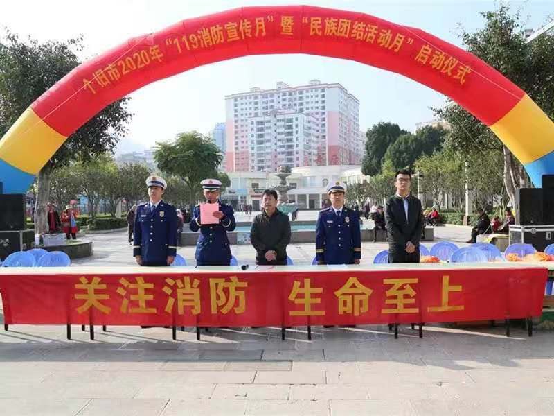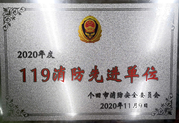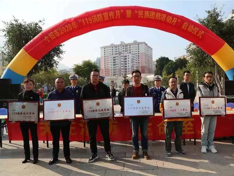 11月9日,个旧市消防安全委员会在工人文化宫举行2020年度“119”消防宣传月暨“民族团结活动月”启动仪式。云南老虎山酒业有限责任公司和云南锡业集团宾馆有限公司两个消防重点单位荣获个旧市2020年度 “119消防先进单位”荣誉称号。