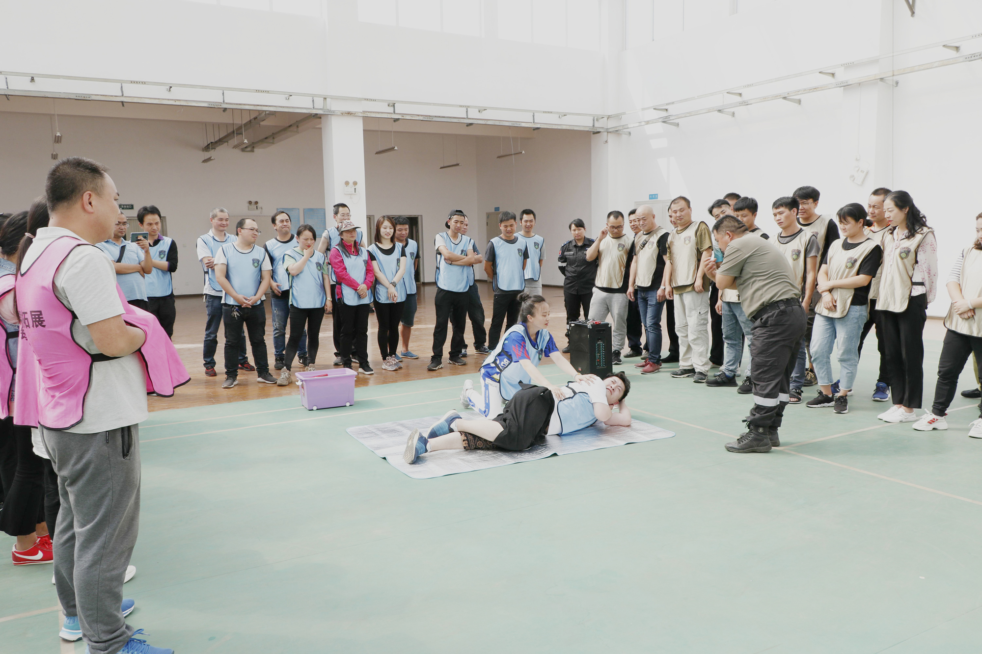 下午的应急处置与自救逃生实际操作培训中,来自专业救援队的两位老师现场示范讲解了伤情判断、应急止血包扎、简易骨折固定、心肺复苏等外伤急救方法,强调了确保环境安全再救人、保护好自己再救人、先拨打医疗急救电话再救人和自己不会不施救等基本救护原则,并指导学员进行实际操作演练。