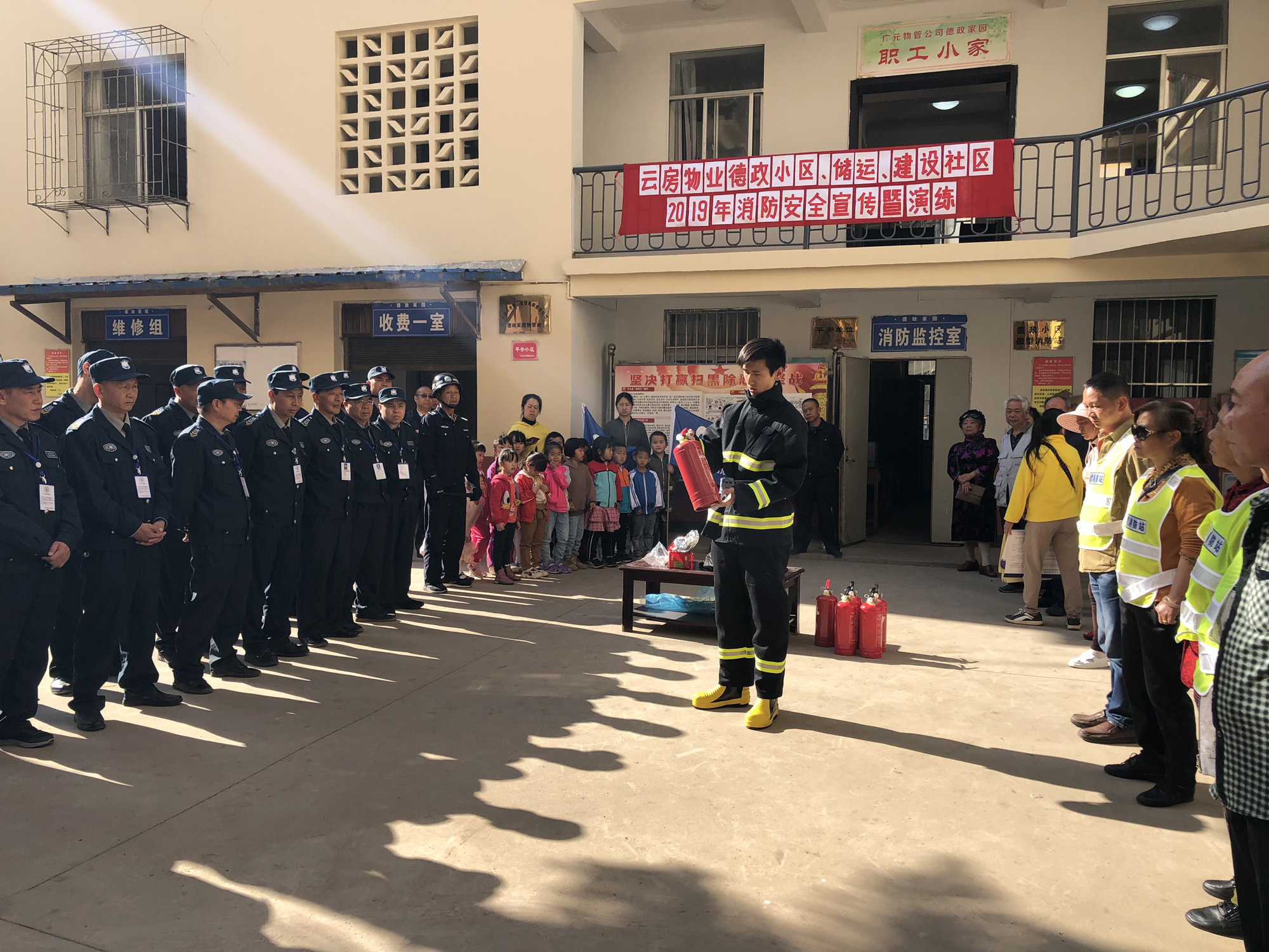 活动当天,物业工作人员向广大职工、住户耐心细致地讲解了灭火器具使用和火场自救逃生方法,随后开展了灭火演练,并通过展板展现了大量实例和火灾现场,让广大职工、住户更加直观的认识火灾事故的危害和灭火器的正确使用方法。