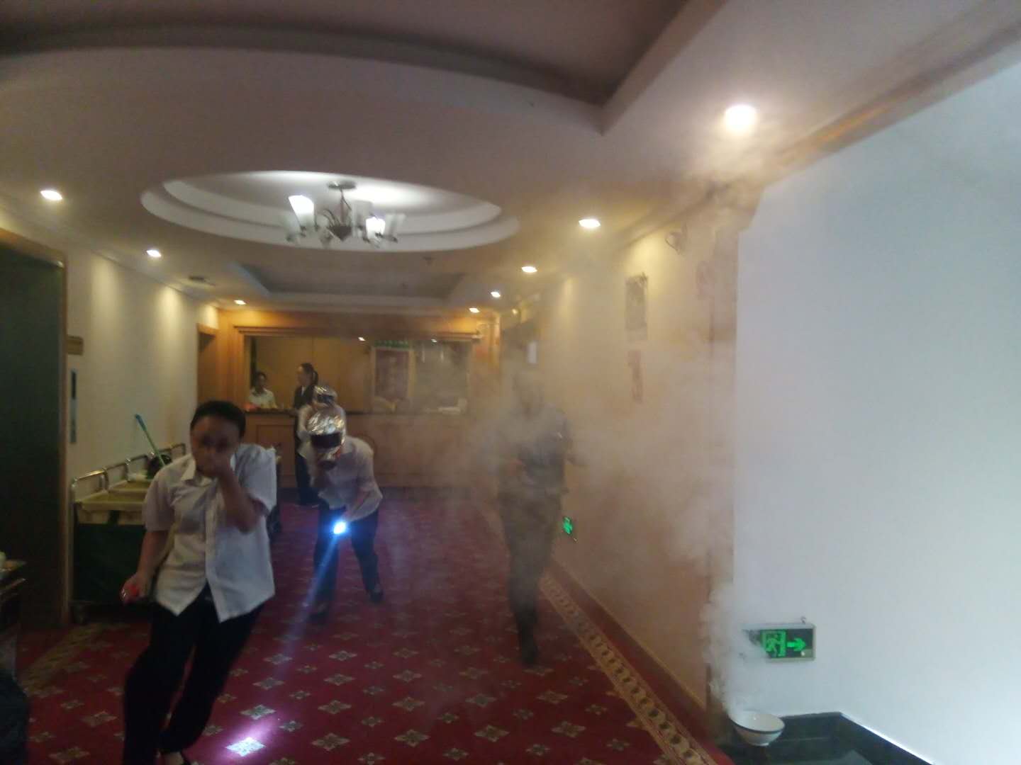 演练模拟宾馆2号楼216库房内起火,火灾自动报警系统发出火情警报后,各部门员工听到报警铃后按照预定方案,迅速开展相关应急处置程序。