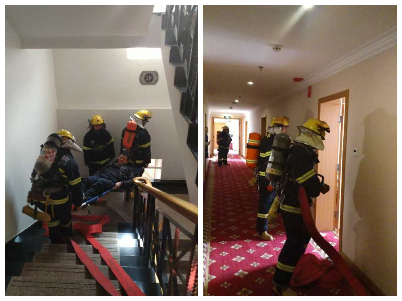 演练前,消防中队队员对宾馆内部的重点部位、消防设施、安全出口、消防水源等情况进行了全面细致的了解和熟悉。模拟演练中,假设客房212房间起火,有一人被困,随着指挥员一声令下,演练正式开始。消防队员按照各自的分工,各战斗小组,从火情侦查、水源选择、进攻路线、阵地设置等,有序地展开灭火救援行动。