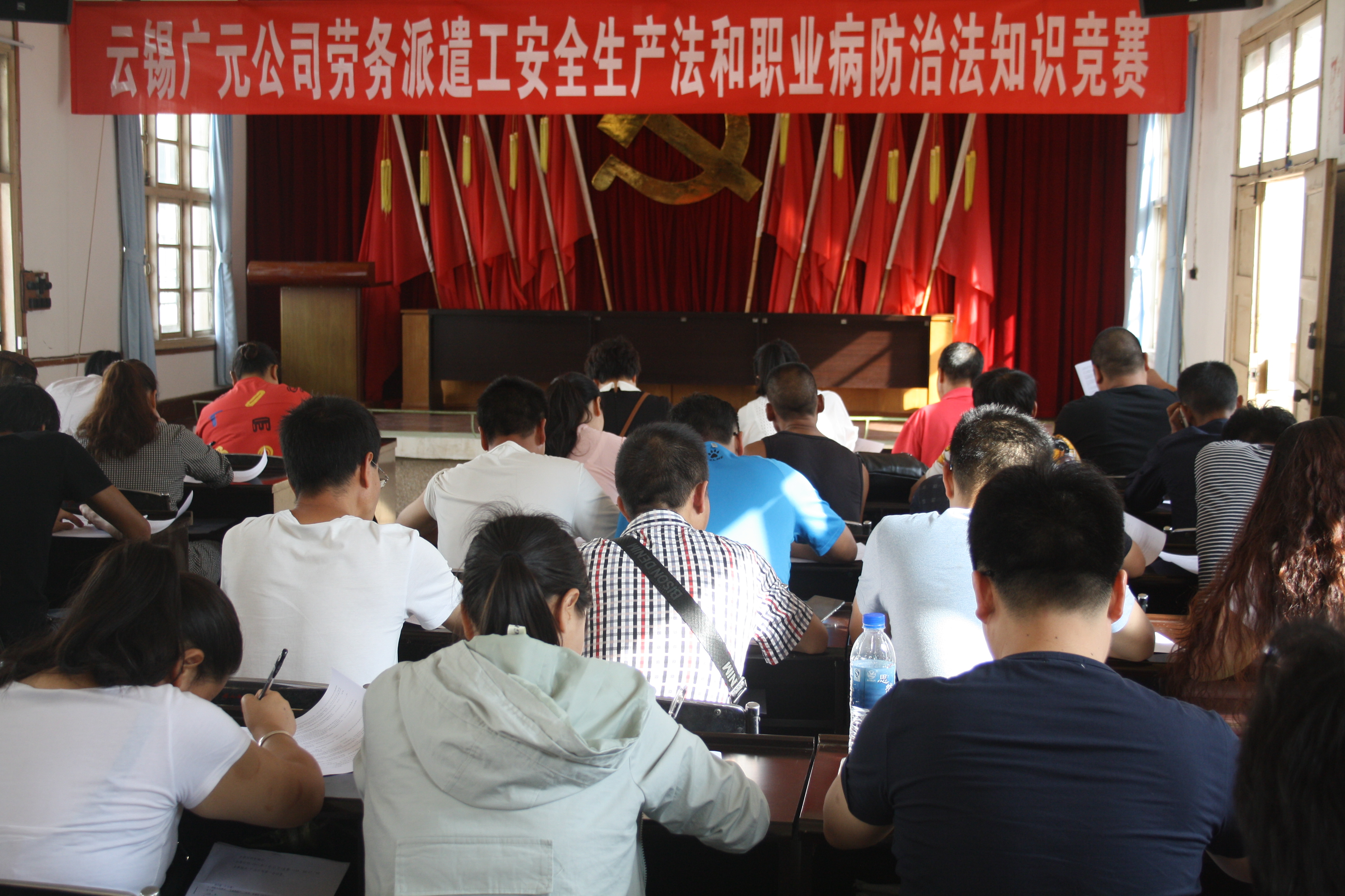 为进一步深化云岭职工素质建设工程,拓展劳务派遣工引导性培训受众面,增强广大劳务派遣工守法和依法维护自身权益的意识,广元公司工会于7月31日在供水公司五楼会议室组织50名劳务派遣工进行安全生产法、职业病防治法知识竞赛预赛。