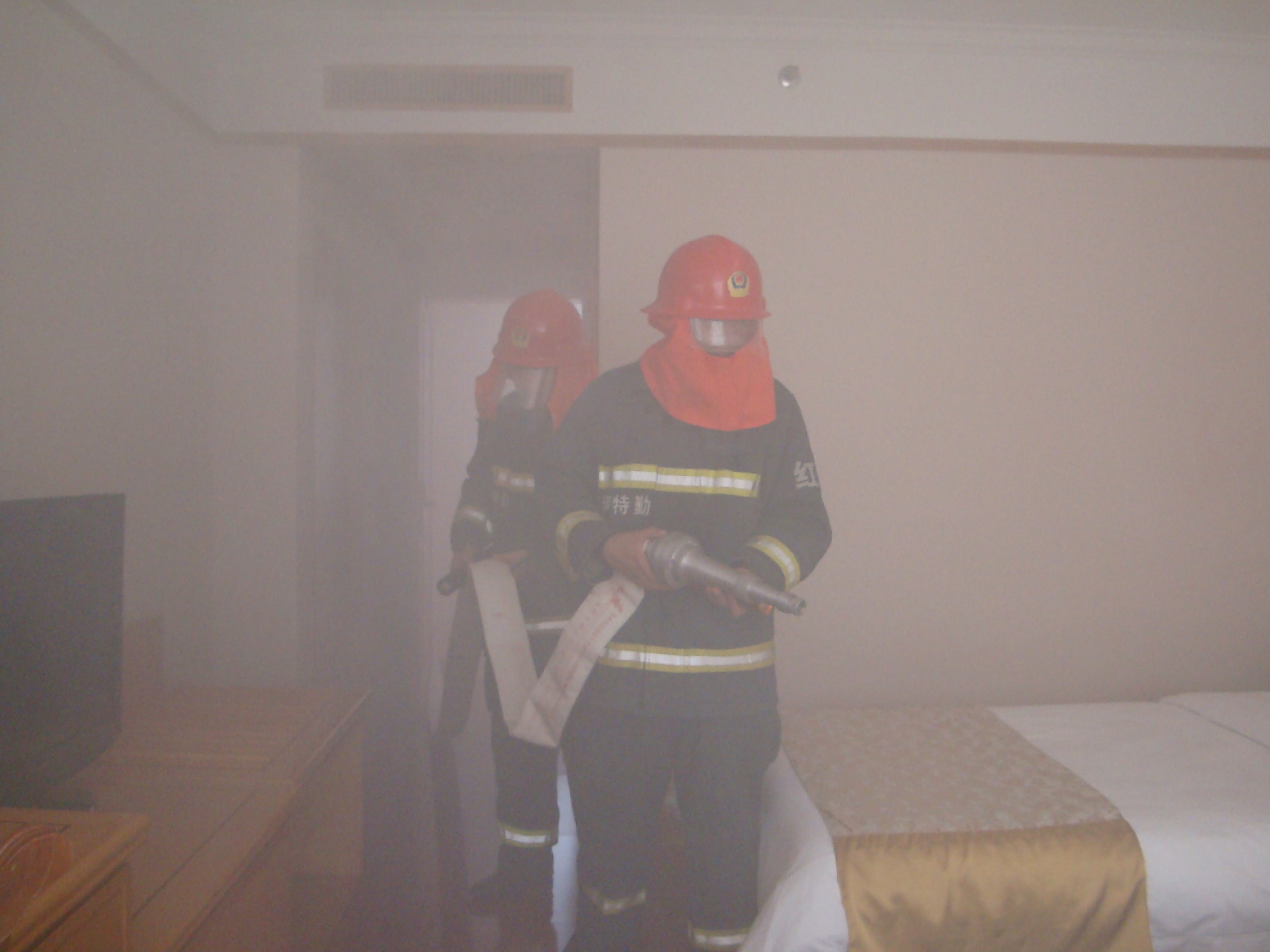 演练前,宾馆组织41名员工学习了灭火器操作知识、呼吸逃生器的使用、消防水带的连接方法等。此次消防安全应急预案演练是假设宾馆客房发生火情,员工及时发现并报警,并组织对初起火灾的扑救及人员进行疏散。各参练人员职责明确、程序规范、配合默契,顺利完成了演练。